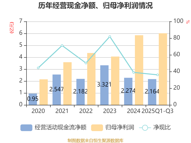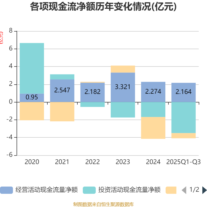 2025年前三季度,公司经营活动现金流净额为2.16亿元,同比增长76.53%;筹资活动现金流净额-5820.07万元,同比增加8186.64万元;投资活动现金流净额-3.5亿元,上年同期为-1047.71万元。