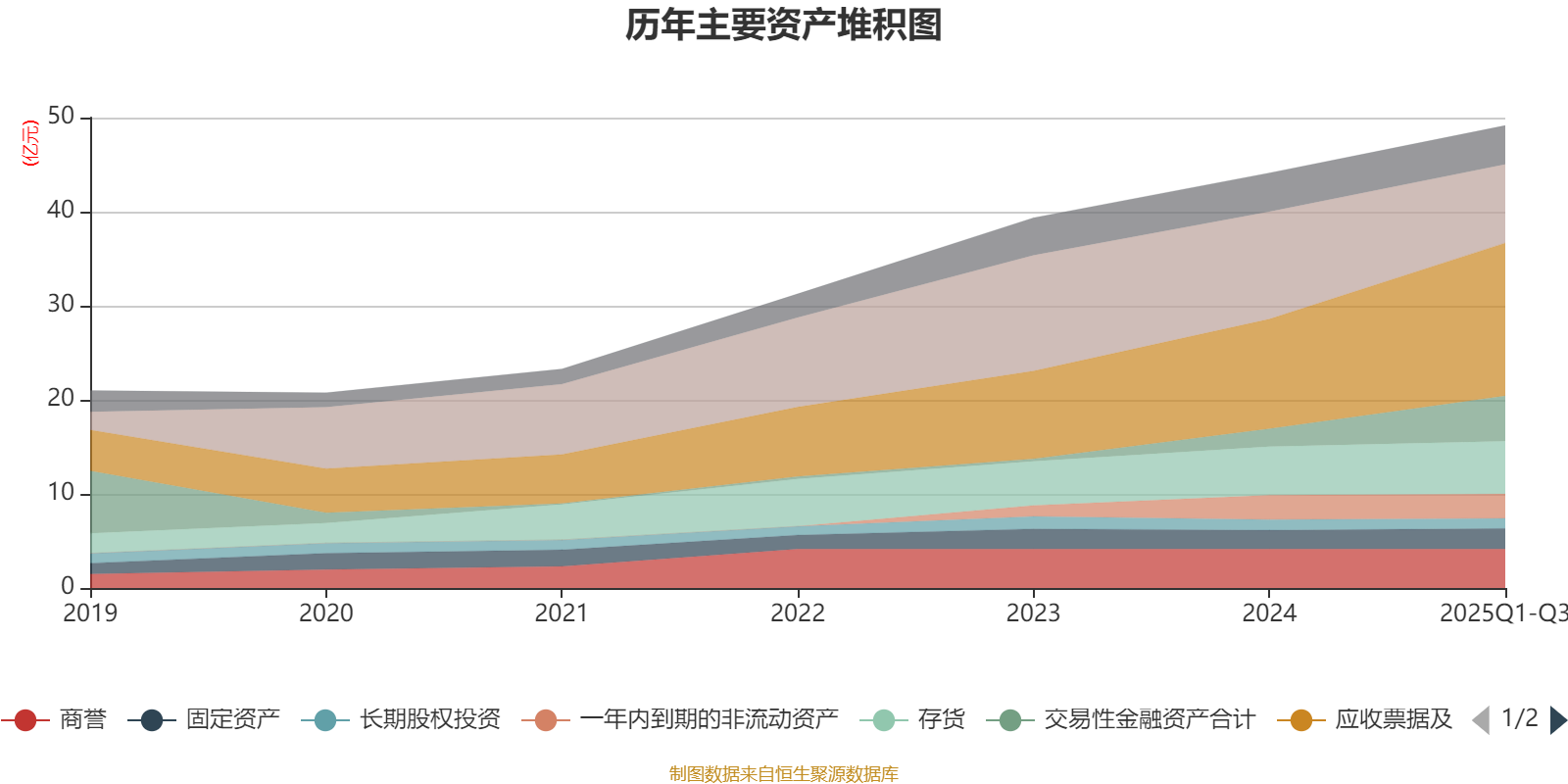 资产重大变化方面,截至2025年三季度末,公司货币资金较上年末减少26.74%,占公司总资产比重下降8.86个百分点;应收票据及应收账款较上年末增加39.44%,占公司总资产比重上升6.65个百分点;交易性金融资产合计较上年末增加152.86%,占公司总资产比重上升5.49个百分点;应收款项融资较上年末增加92.91%,占公司总资产比重上升1.18个百分点。