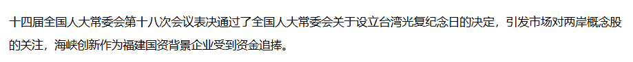 海峡创新300300:软件+海峡两岸概念。海峡创新周一20厘米强势涨停,最近几天的走势整体比较强势,上涨趋势也比较明显,行情可能还有空间,短线仍然可以作为观察对象。