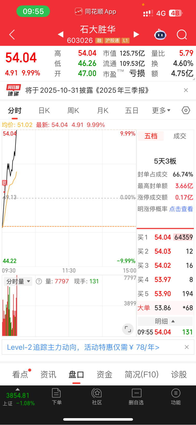 $石大胜华(SH603026)$ 53卖掉的部分.49.5买回来了