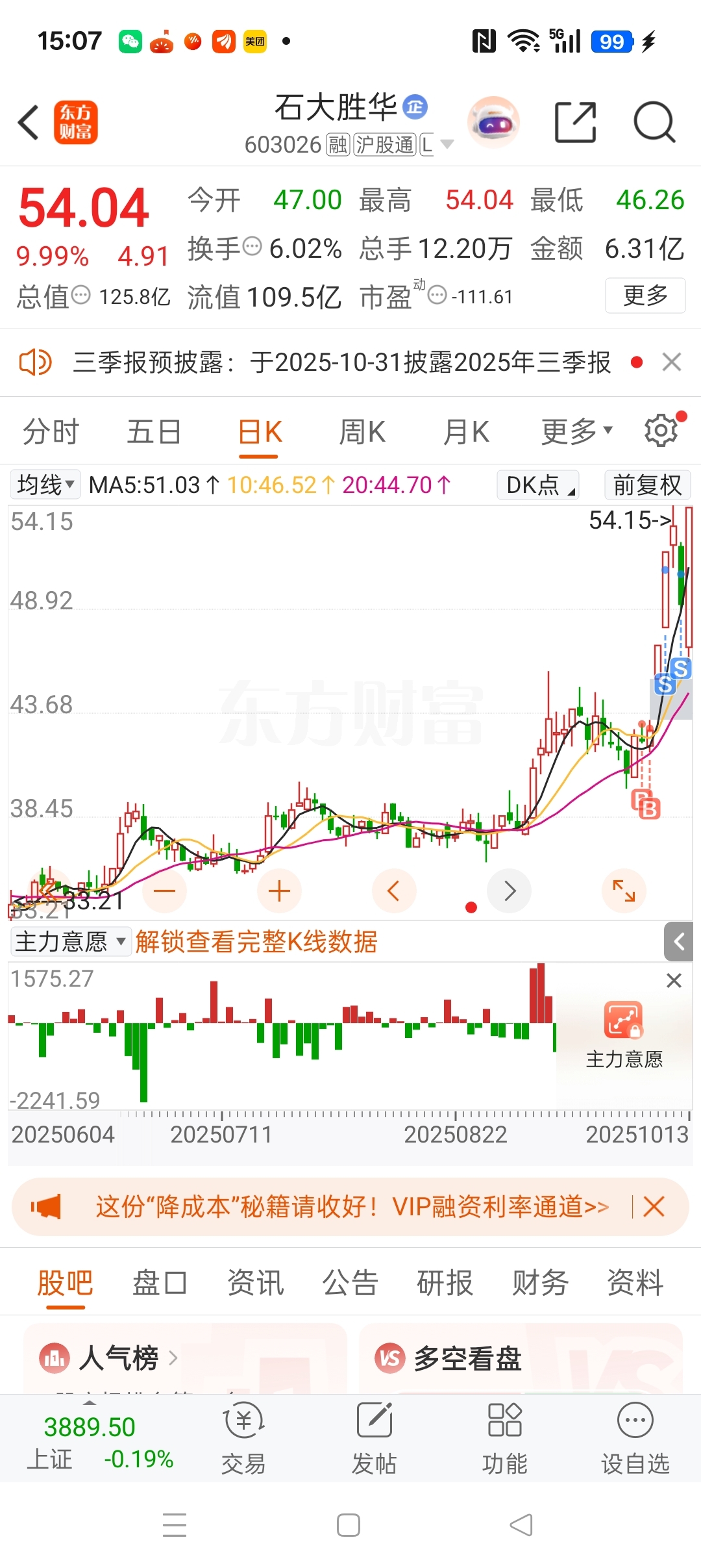 $石大胜华(SH603026)$ 进得刚刚好,可惜了,卖了一半