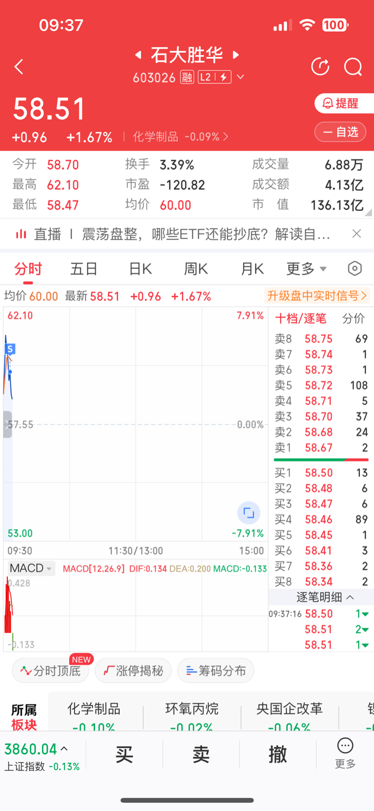 $石大胜华(SH603026)$ 打板最后一次信你,上不去就再见了