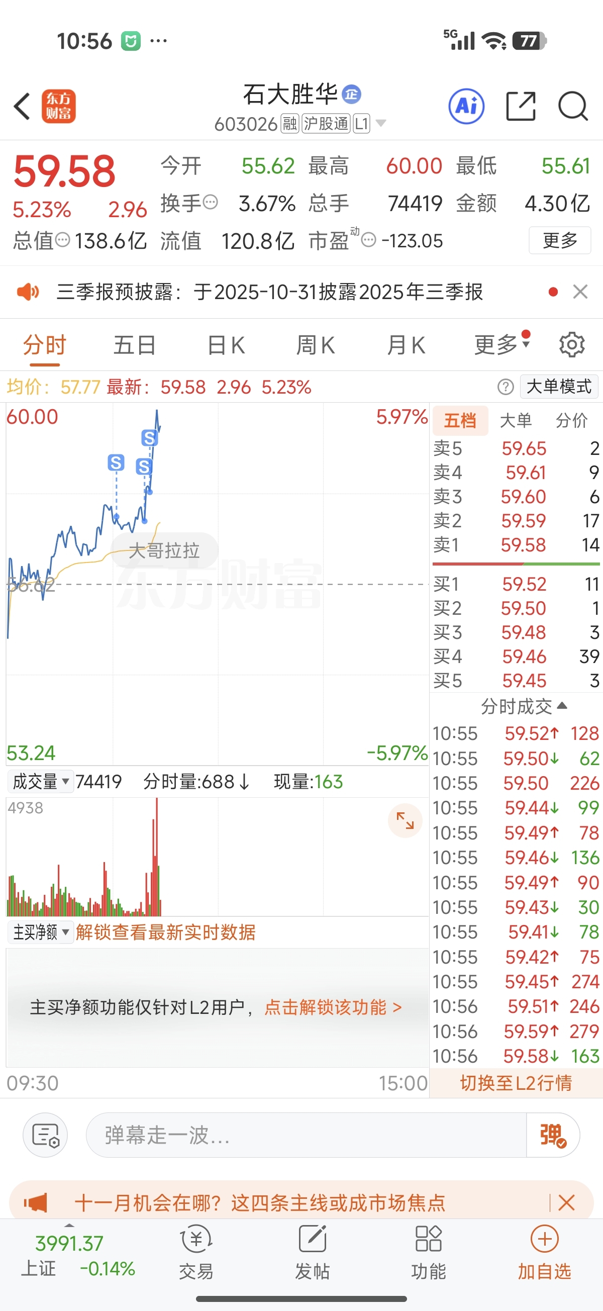 $石大胜华(SH603026)$ 太韭菜了,怕今天大盘上4000下午下杀,就全出了。刚卖就大涨