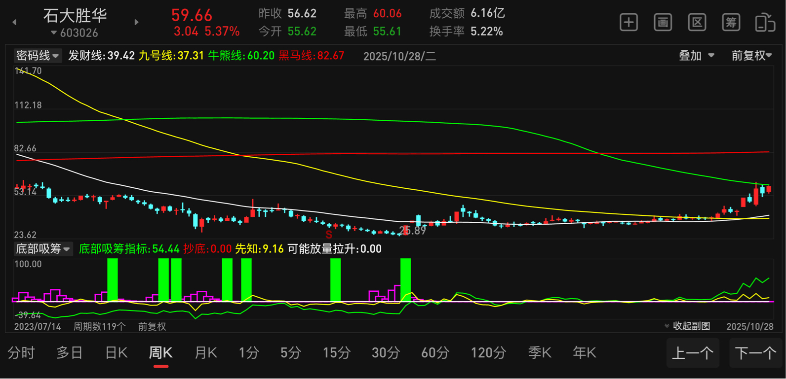 $石大胜华(SH603026)$ 周线牛熊线60.2是你目前最重要的一道坎儿,如能有效突破就奔黑马线82.67去