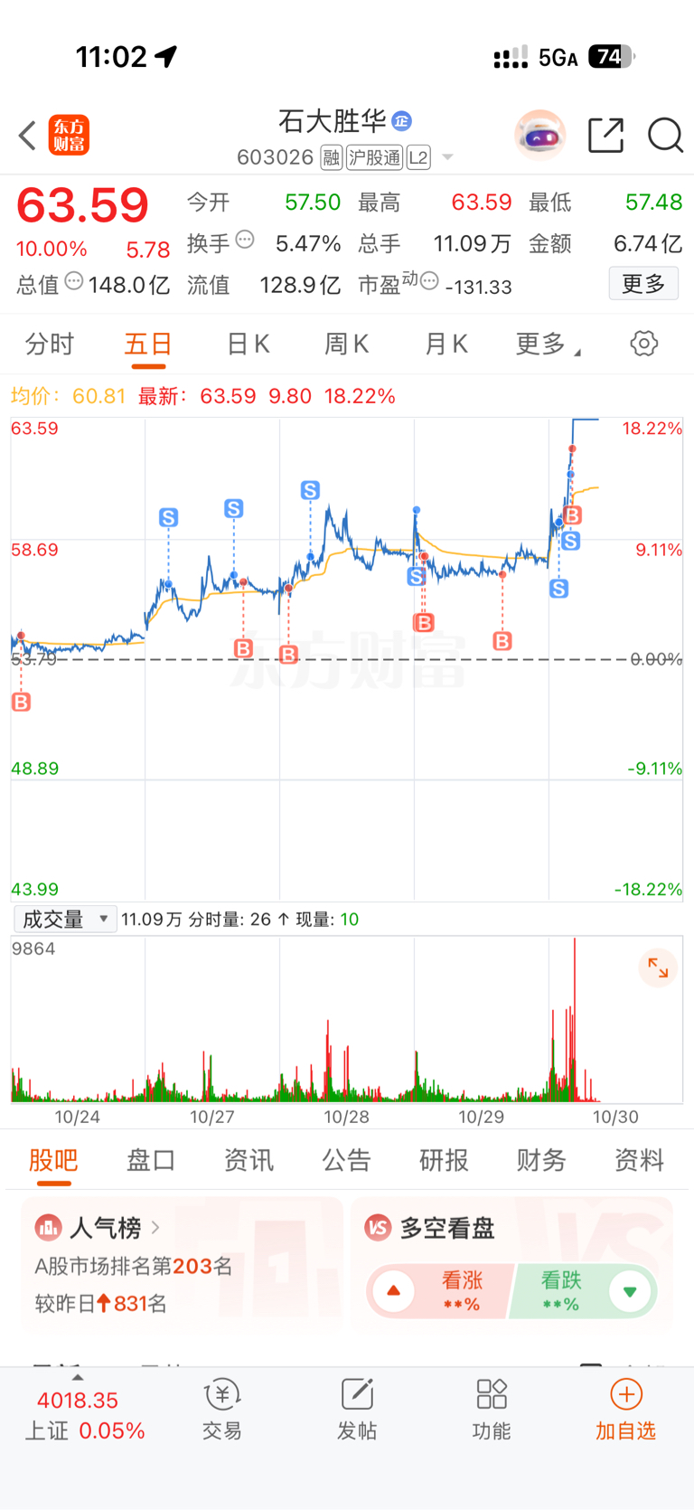 $石大胜华(SH603026)$ 今天做反T,失败了
