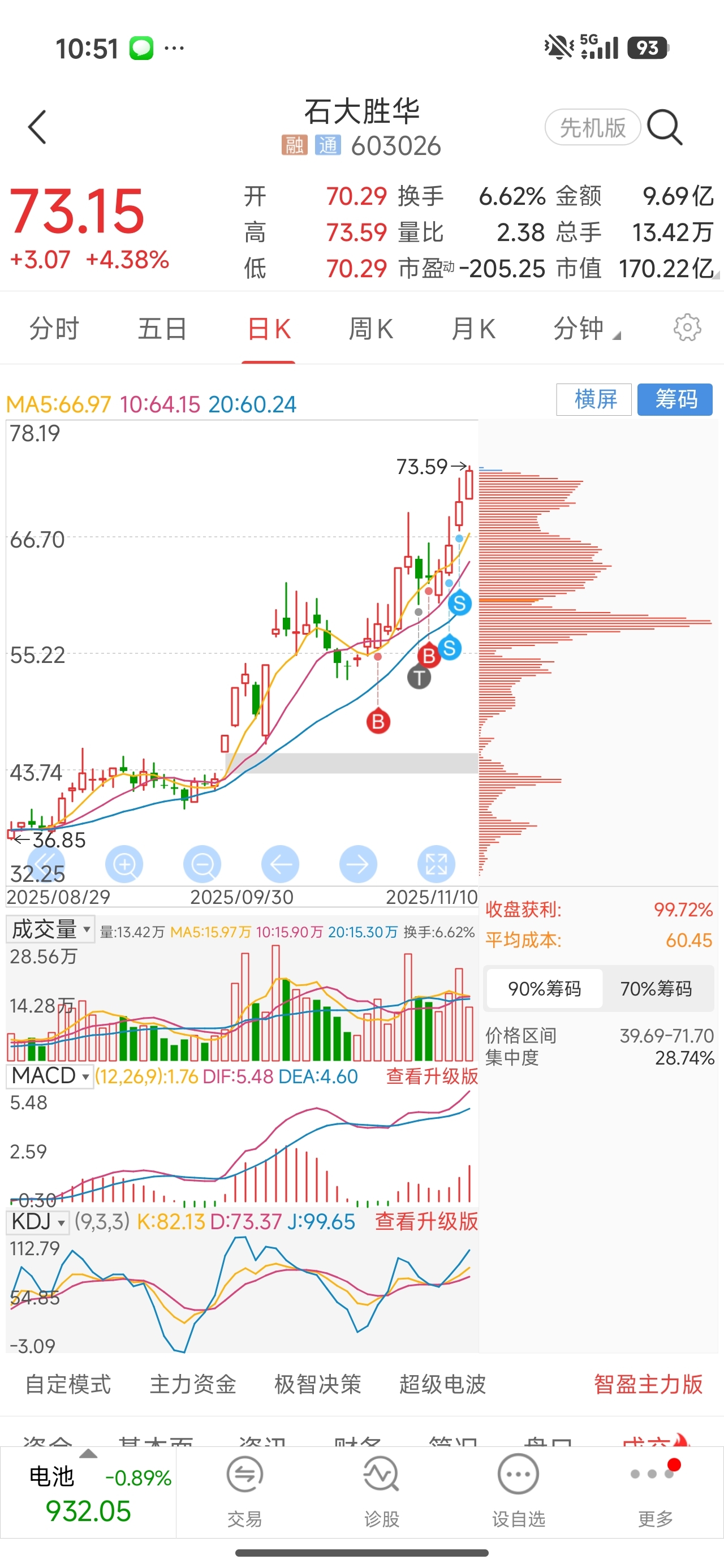 $石大胜华(SH603026)$ 周五卖了就后悔,不过今天不敢追了,等回调着吧