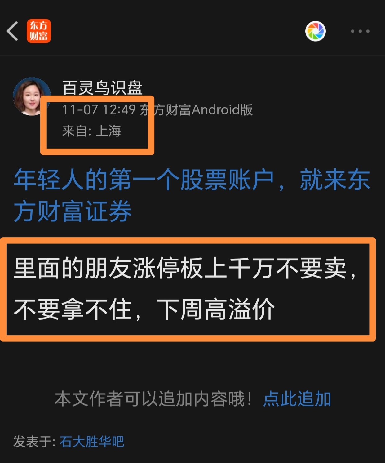 郑重声明:用户在财富号/股吧/博客等社区发表的所有信息(包括但不限于文字、视频、音频、数据及图表)仅代表个人观点,与本网站立场无关,不对您构成任何投资建议,据此操作风险自担。请勿相信代客理财、免费荐股和炒股培训等宣传内容,远离非法证券活动。请勿添加发言用户的手机号码、公众号、微博、微信及QQ等信息,谨防上当受骗!