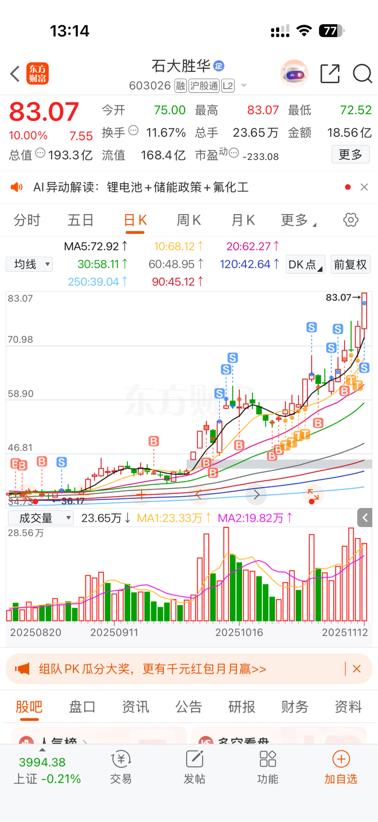 $石大胜华(SH603026)$ 卖飞一半。真是大牛股啊,剩一点点底仓,已满足了