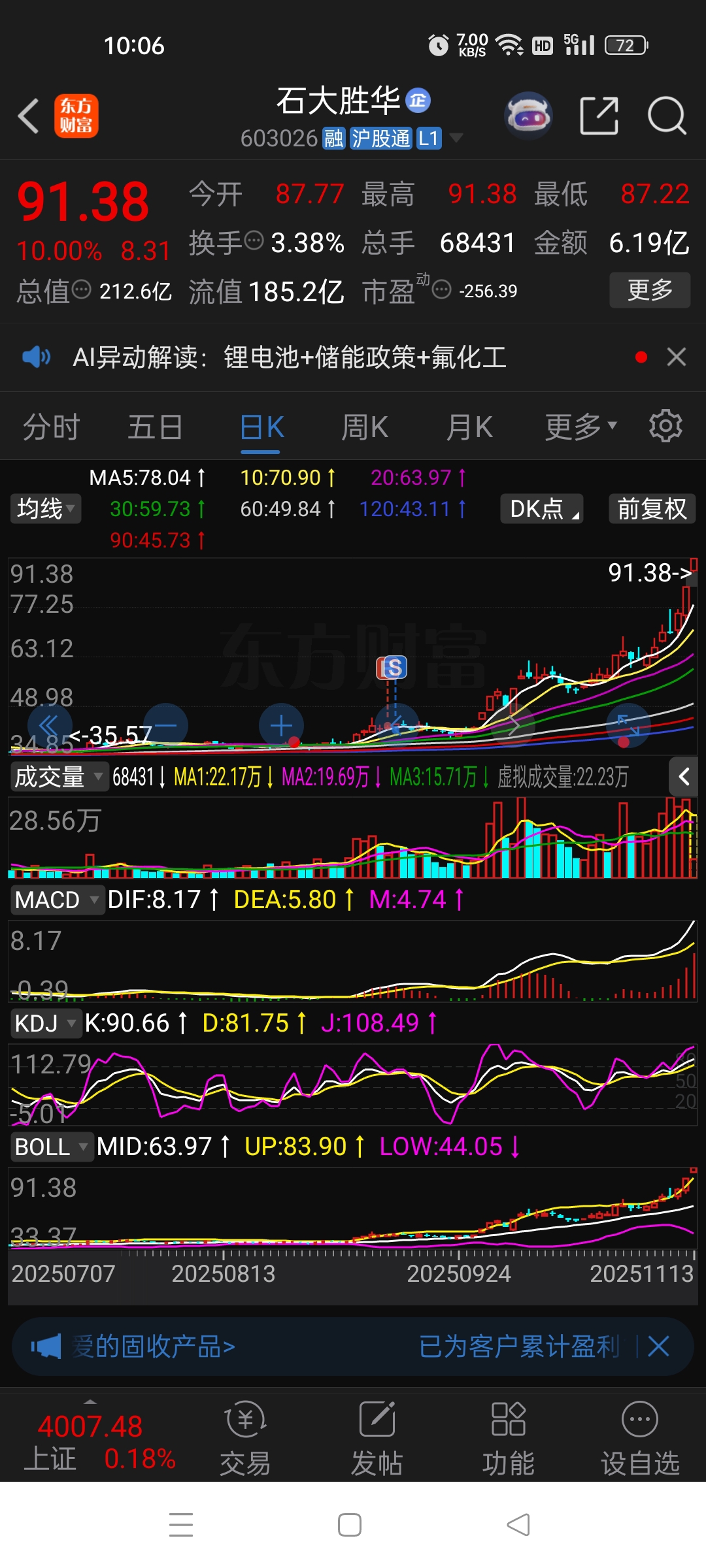 $石大胜华(SH603026)$ 嘛笔的当时亏上百走的,现在翻一倍多了