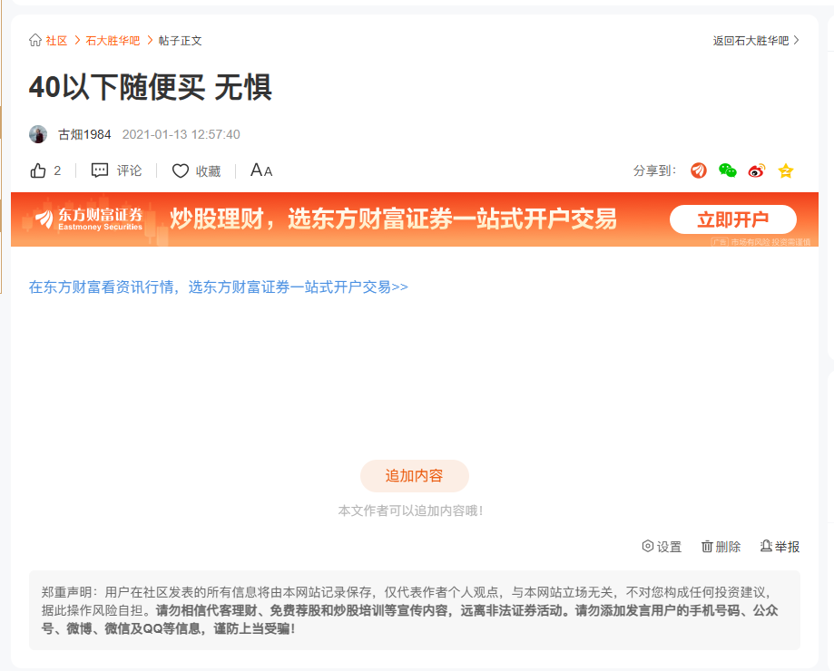 温馨提示: 1.根据《证券法》规定,禁止编造、传播虚假信息或者误导性信息,扰乱证券市场;2.用户在本社区发表的所有资料、言论等仅代表个人观点,与本网站立场无关,不对您构成任何投资建议。用户应基于自己的独立判断,自行决定证券投资并承担相应风险。《东方财富社区管理规定》