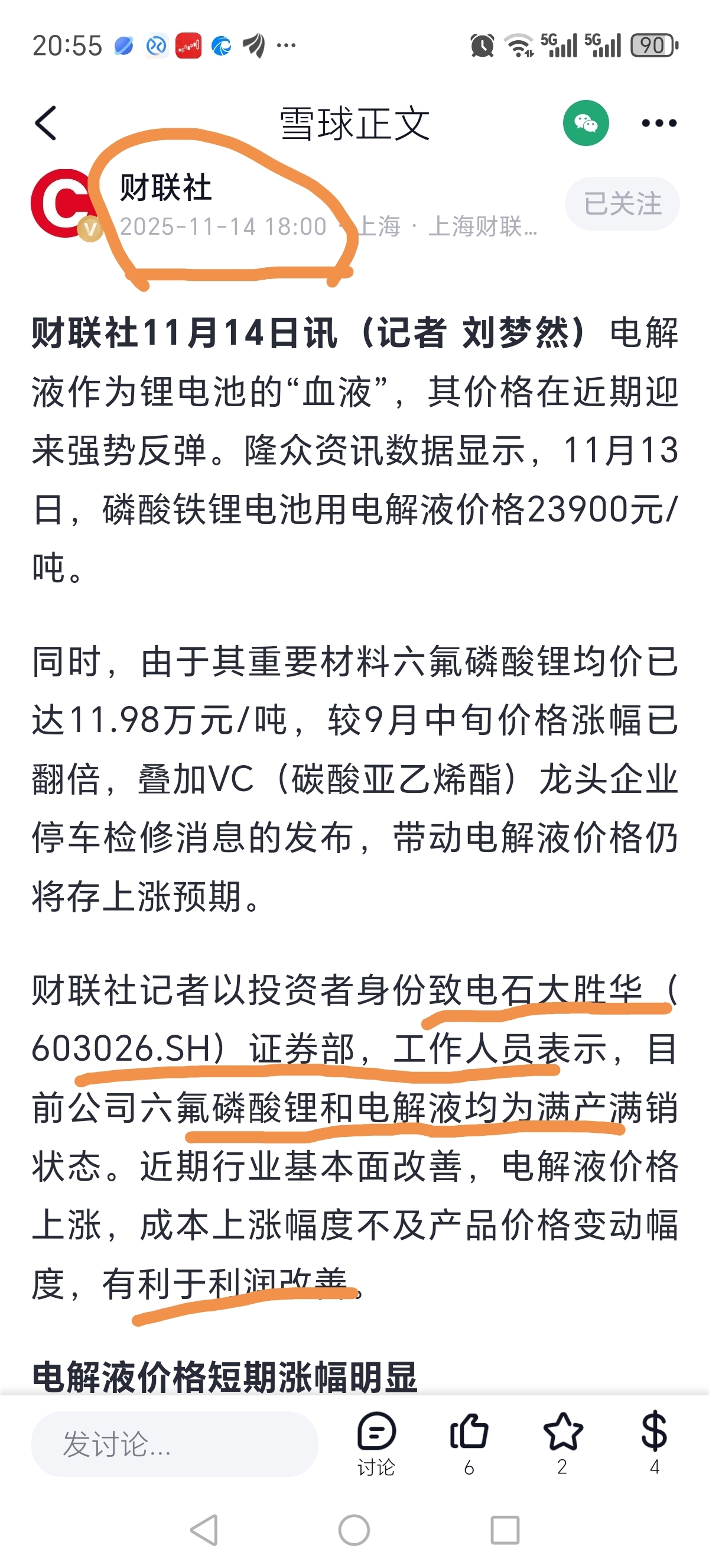 $石大胜华(SH603026)$ 财联社记者以投资者身份致电石大胜华证券部,工作人员表示,目前公司六氟磷酸锂和电解液均为满产满销状态。近期行业基本面改善,电解液价格上涨,成本上涨幅度不及产品价格变动幅度,有利于利润改善。