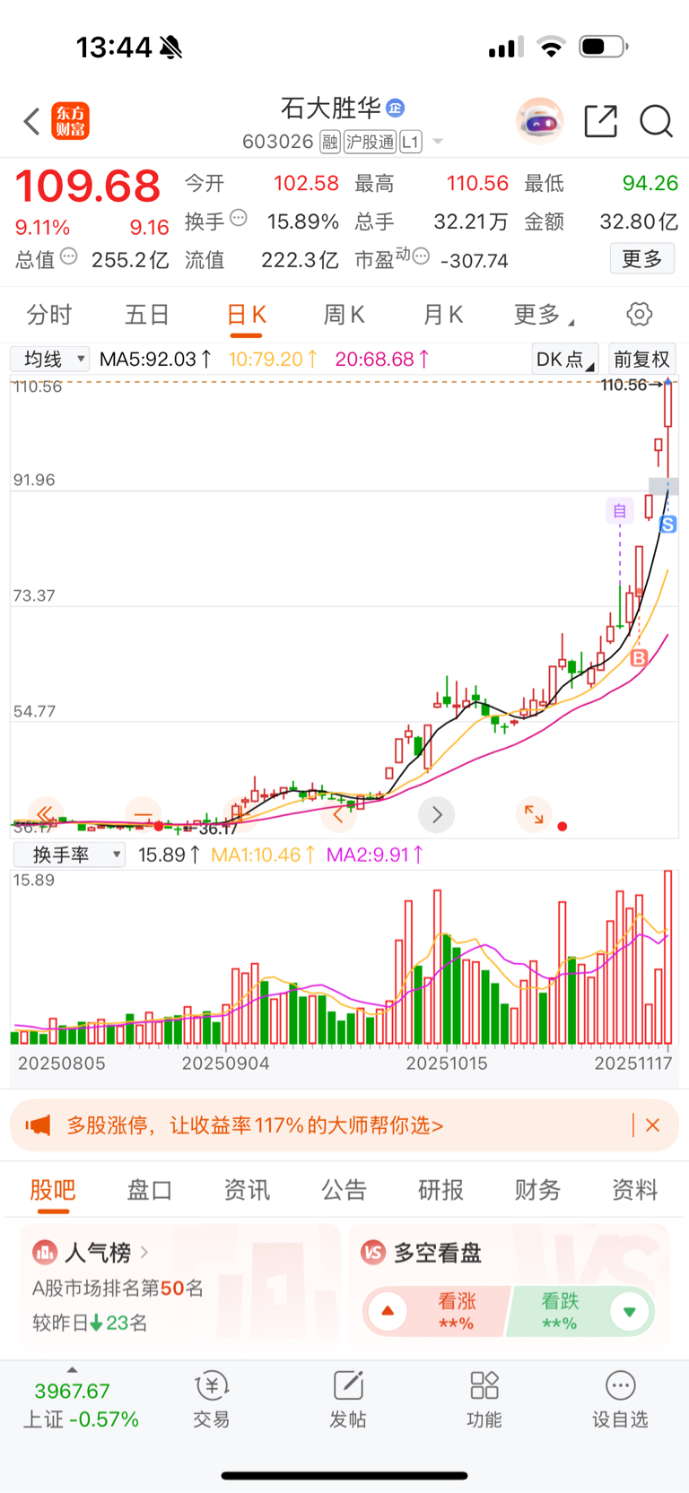 $石大胜华(SH603026)$ 昨天卖了~今天接回来