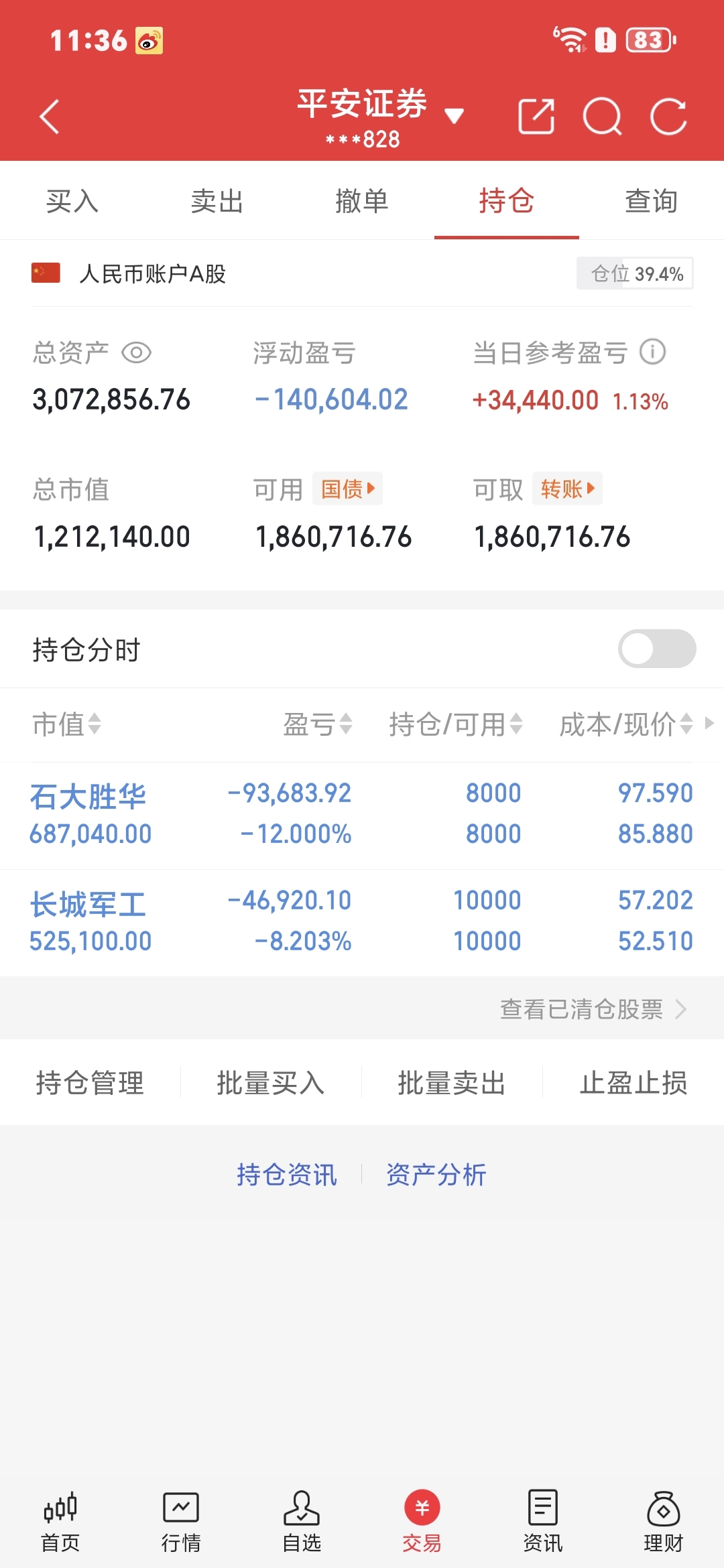 今日持有: $石大胜华(SH603026)$ $长城军工(SH601606)$ 坚持过完这周,下周开始调整