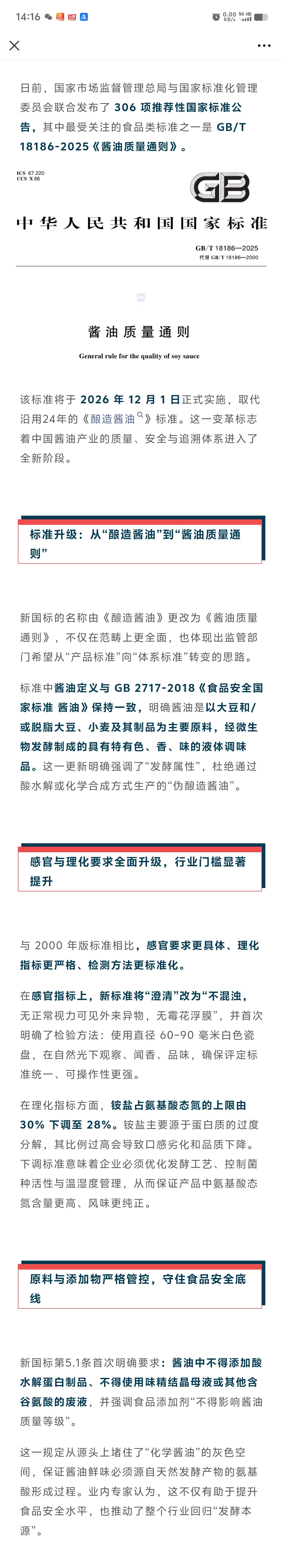 $千禾味业(SH603027)$ $海天味业(SH603288)$ $中炬高新(SH600872)$ 酱油 新国标将于2026年12月1日实施,最大的变化是不得添加酸水解蛋白母液,不得使用味精结晶母液或其他含谷氨酸的废液,并强调添加剂不影响酱油等级。看了大家有什么感觉?
