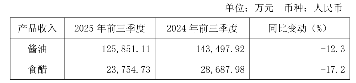 具体产品来看,千禾味业前三季度两大核心产品收入均呈现下滑态势。其主打产品酱油的营收同比下降12.3%至12.59亿元;食醋产品的营收降幅更为显著,同比下降17.2%,降至2.38亿元。
