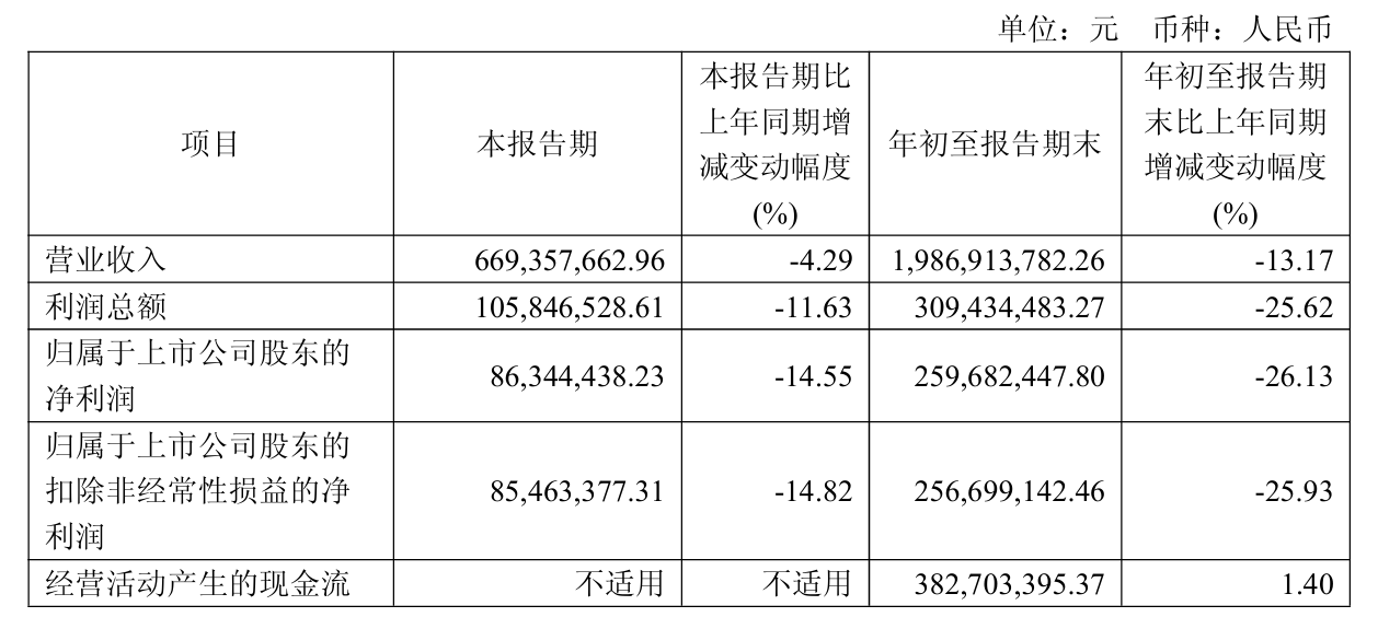第三季度,公司营业收入为6.69亿元,同比下降4.29%;归母净利润为8634.44万元,同比下降14.55%;扣非归母净利润为8546.34万元,同比下降14.82%。