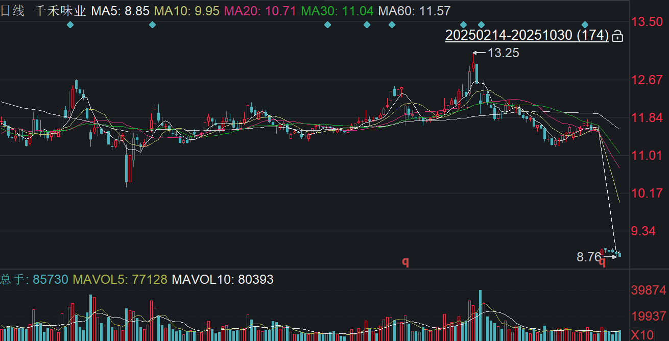 二级市场上,截至30日收盘,千禾味业下跌0.79%报8.76元/股,总市值约116.78亿元,今年来近乎“原地踏步”。和2021年2月的高位相比,公司股价已跌超六成。