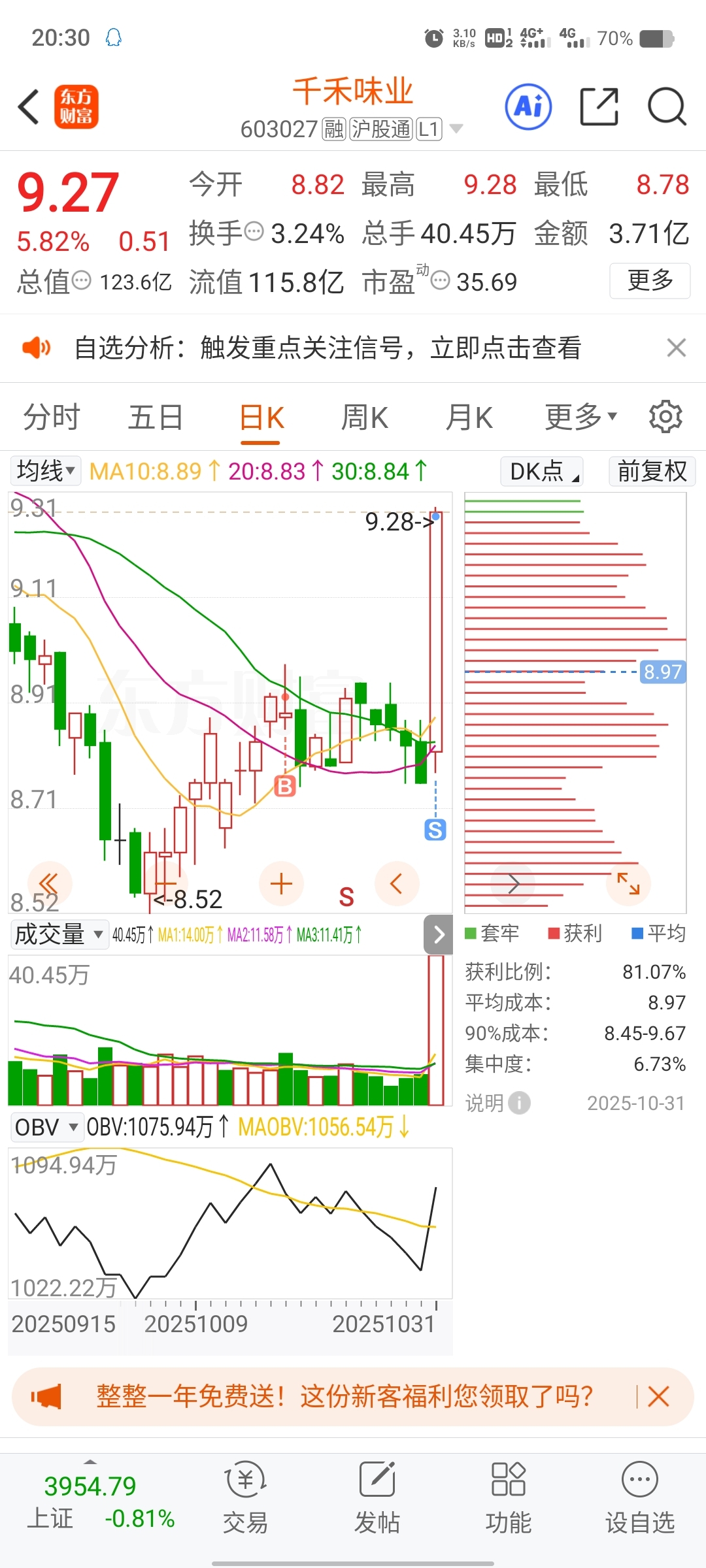 其实我也不卖出,分红前买入为了送股分红,想着如果跌到8元就如仓,今天主力放量买入试盘,下个星期回调再买入,留了一成仓位。持仓还有涪陵榨菜,这些股在历史上最低位,买入做长线,再准备买入桃李面包。以前总是想赚快钱,基本赚不到钱,还亏损。