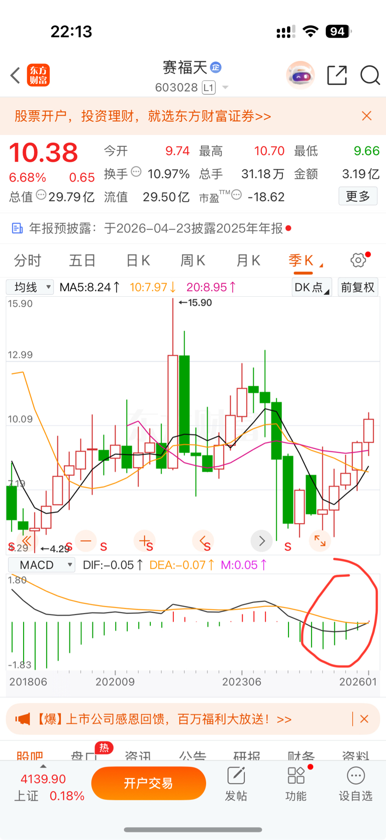$赛福天(SH603028)$ 季线今天刚刚金叉了!