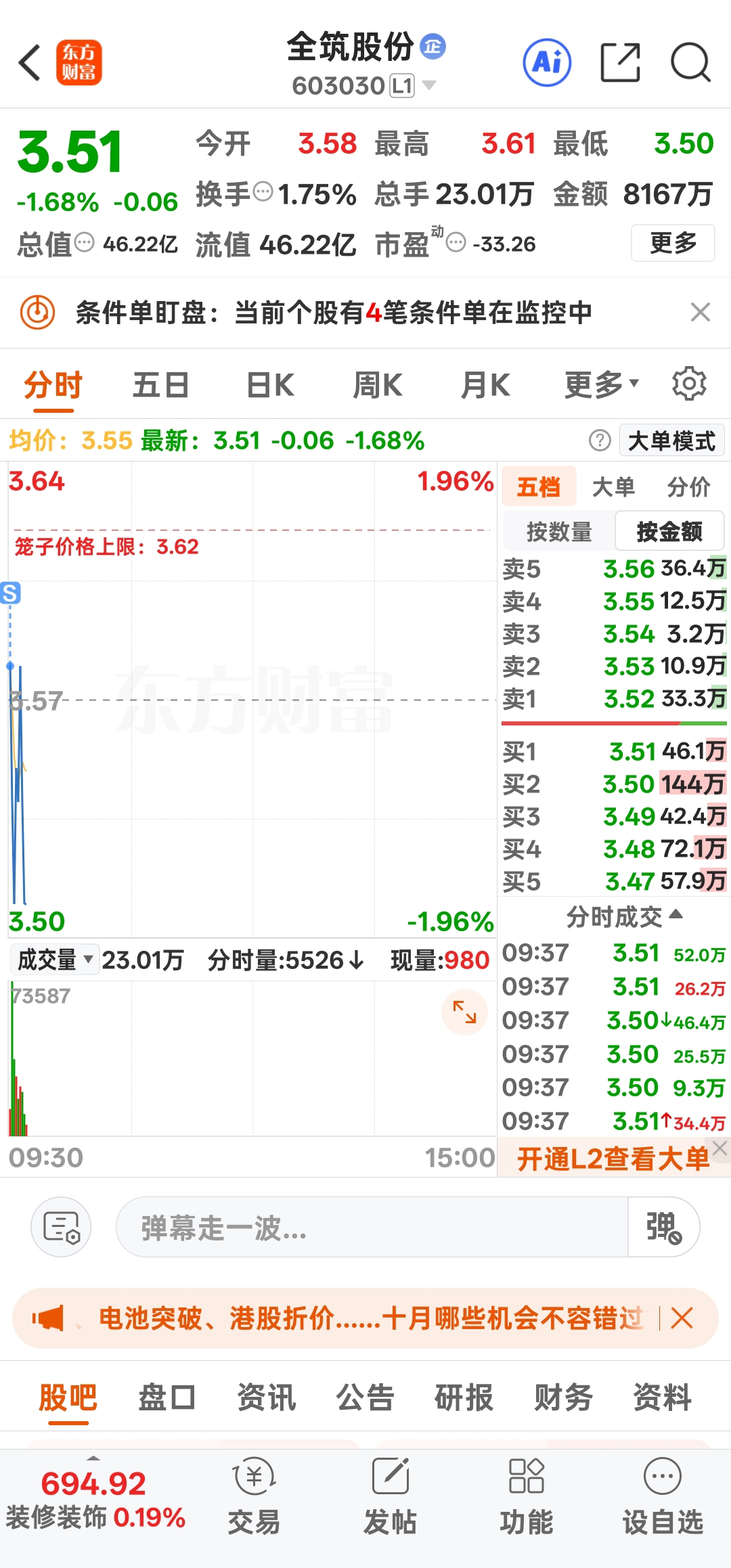$全筑股份(SH603030)$ 开盘走了一个