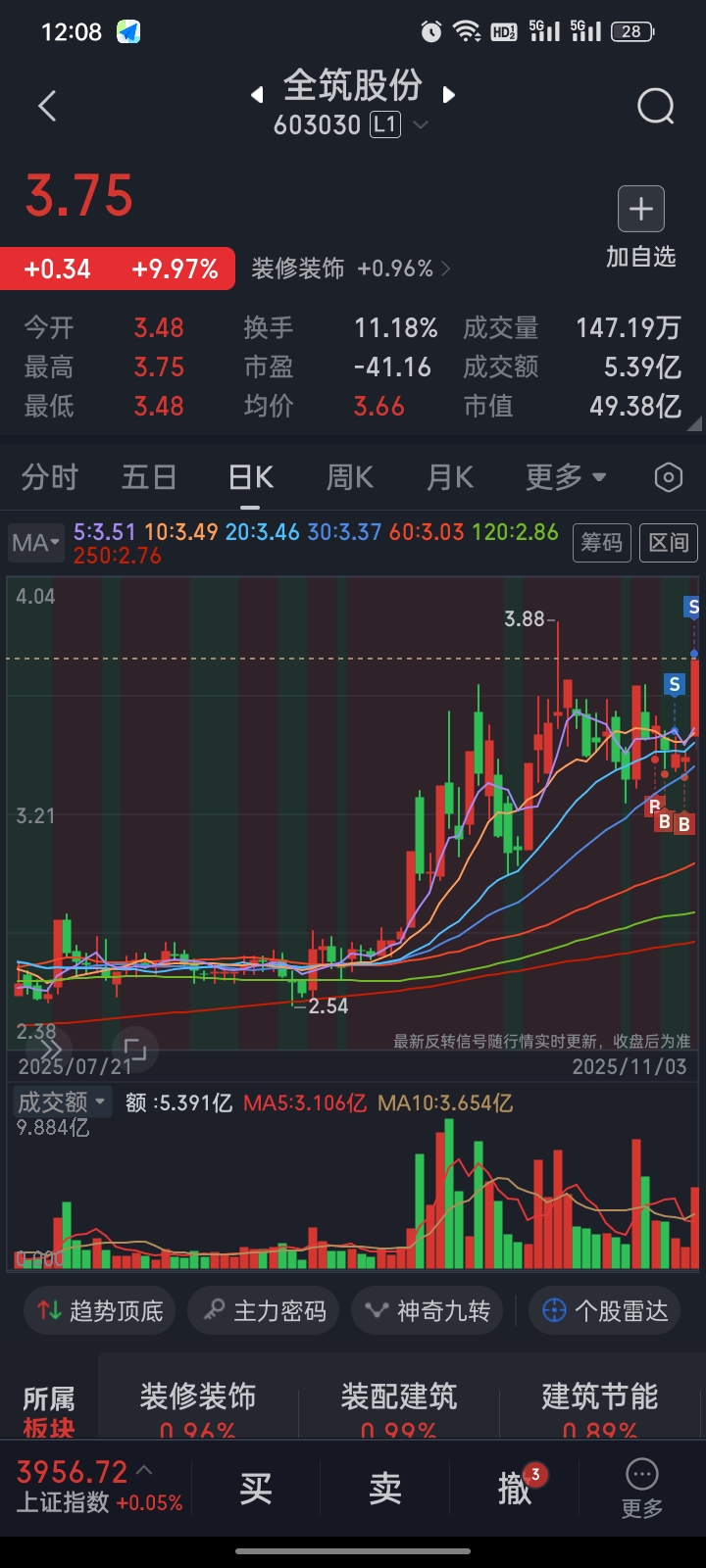 $全筑股份(SH603030)$ 我走了,就做个短线赚了就跑,爱涨到哪不管它了