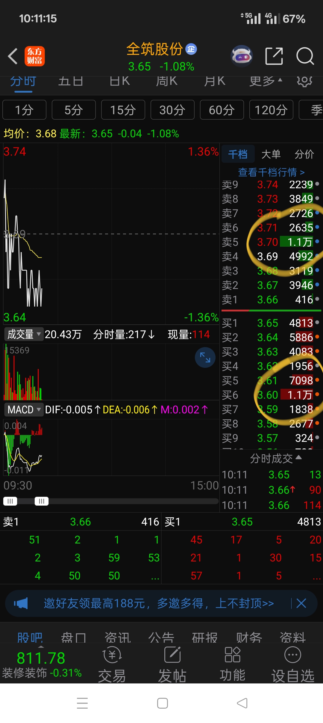 $全筑股份(SH603030)$ 3.6-3.7,有托单,有压单。