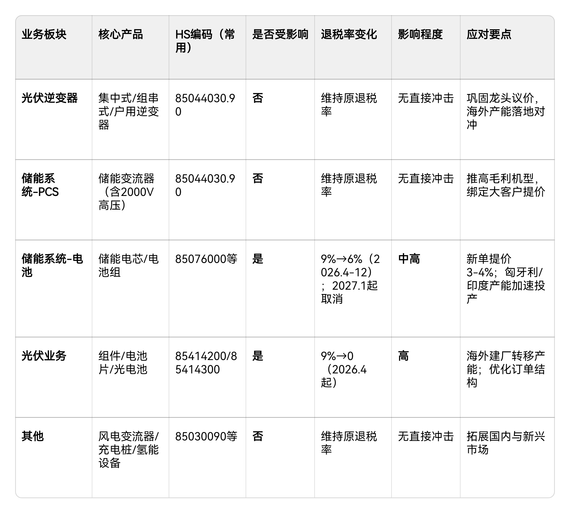 2、储能系统:仅外购储能电池受退税调整影响(2026.4-12退税率9%→6%,2027.1起取消),会影响相关成本与盈利,短期压缩毛利,可通过提价、海外产能(匈牙利、印度等)加速落地,可对冲储能电池退税调整压力。