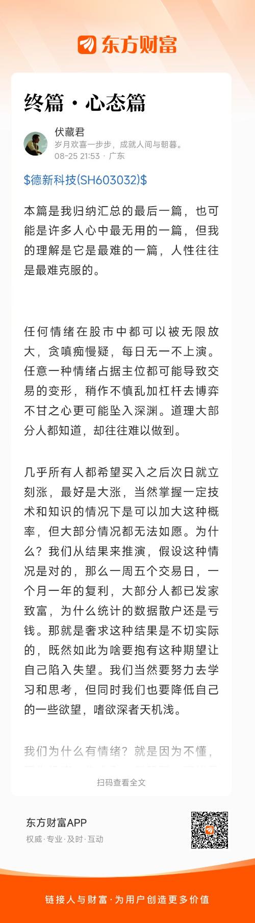 几乎所有人都希望买入之后次日就立刻涨,最好是大涨,当然掌握一定技术和知识的情况下是可以加大这种概率,但大部分情况都无法如愿。为什么?我们从结果来推演,假设这种情况是对的,那么一周五个交易日,一个月一年的复利,大部分人都已发家致富,为什么统计的数据散户还是亏钱。那就是奢求这种结果是不切实际的,既然如此为啥要抱有这种期望让自己陷入失望。我们当然要努力去学习和思考,但同时我们也要降低自己的一些欲望,嗜欲深者天机浅。