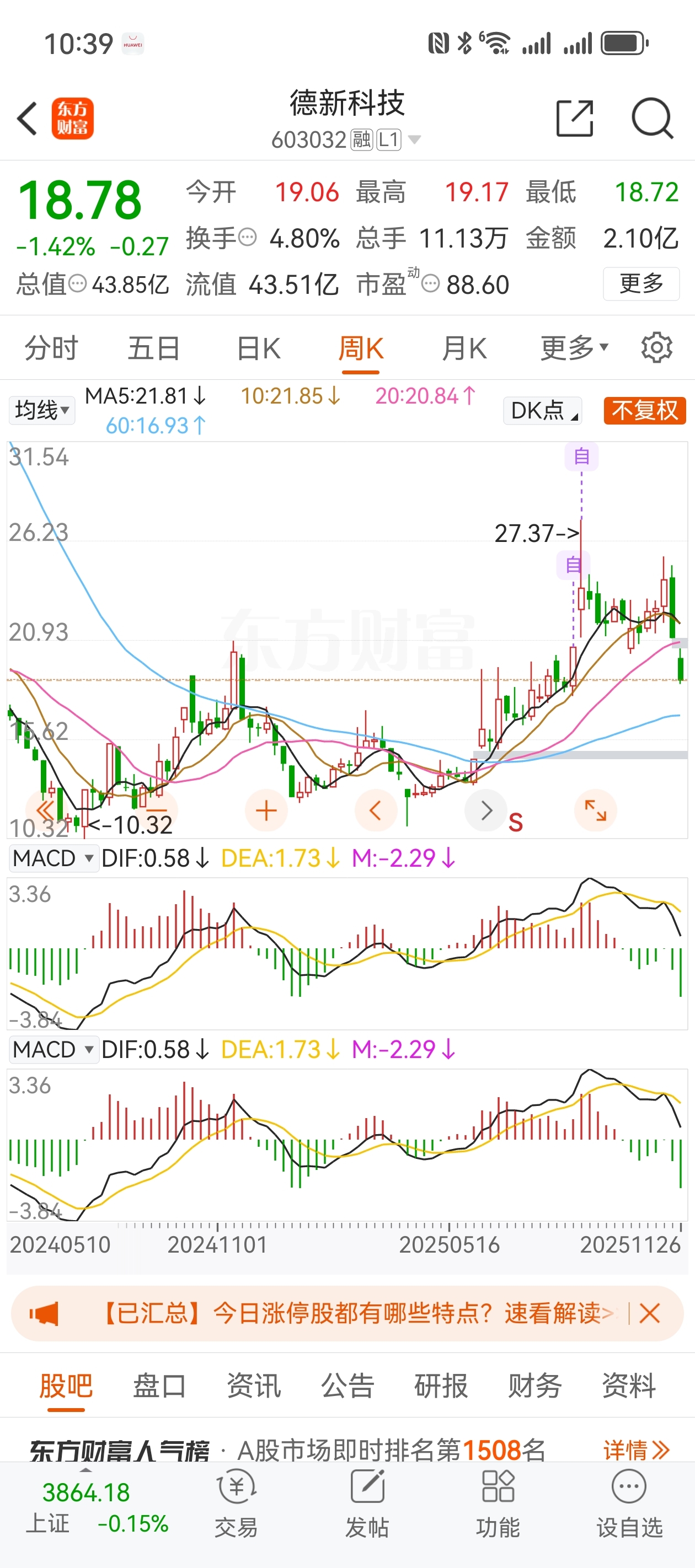 $德新科技(SH603032)$ 周线M头,跳空向下,明天怎么涨也收不回,三月没有行情