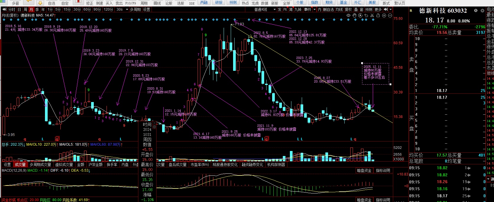 $德新科技(SH603032)$ 这个新疆国投从上市以来8年一共减持19次,从持股38%到5%可以说是清仓式减持。截止3月8号之前,它还有160万股(累计2700万元)需要在二级市场抛售~这个股后面还有一大跌(我估计就是周一,因为新疆国投减持是从来不计成本的,只求快),大跌的时候大概率就是新疆国投减持结束!想要抄底的可以等大跌加!