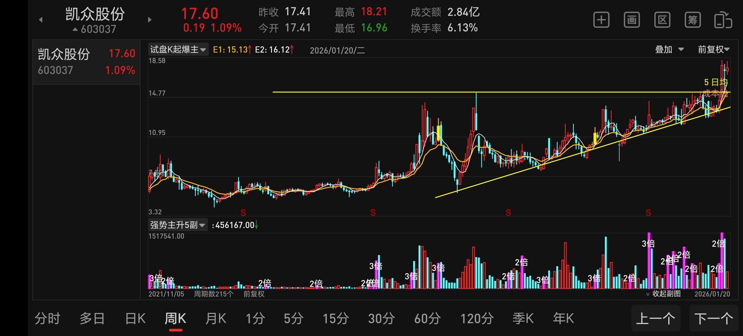 $凯众股份(SH603037)$ 今天这个压回5日线压的漂亮,日线老鸭头要张开了,昨天有人说要做双头我一笑而过,看看周线的大突围,大级别的行情就要启动,日线怎么可能做双头见顶呢,真正的主升浪行情就要揭幕了,记录个人投资历程,个人观点,不构成操作建议!
