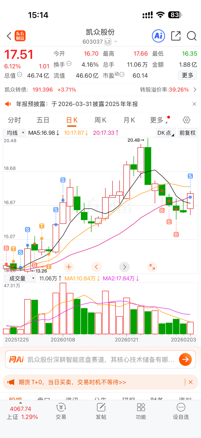 $凯众股份(SH603037)$ 还不算太菜,先保利润,让30万底仓去跑,今天跑了20个