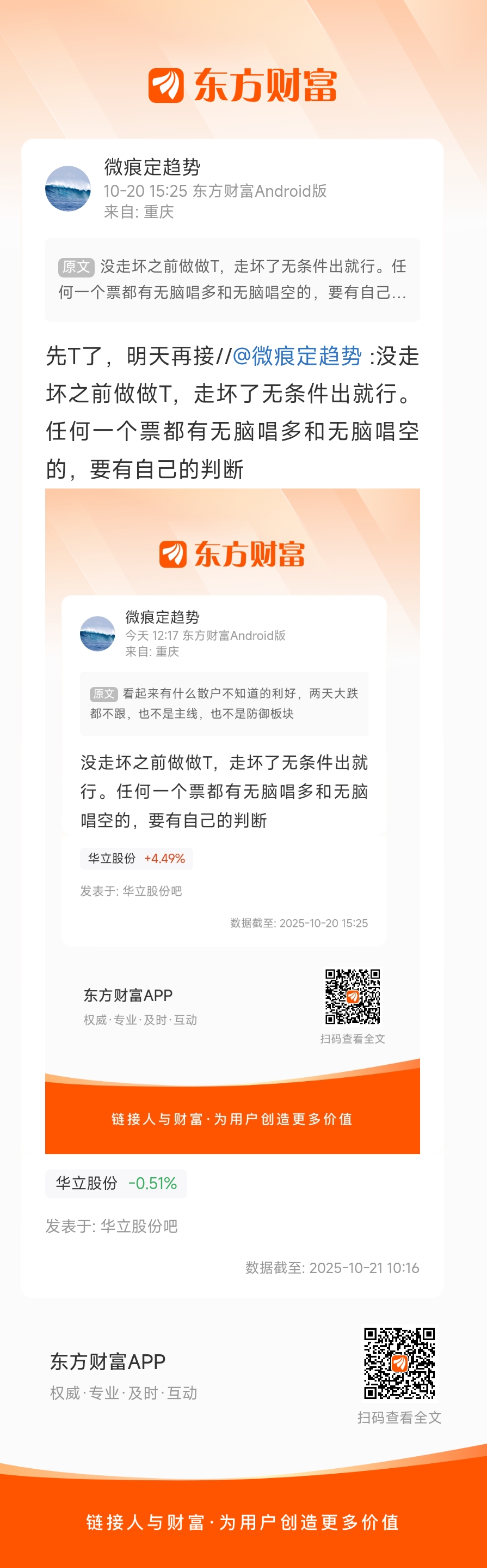 早上接的再T//@微痕定趋势 :先T了,明天再接//@微痕定趋势 :没走坏之前做做T,走坏了无条件出就行。任何一个票都有无脑唱多和无脑唱空的,要有自己的判断