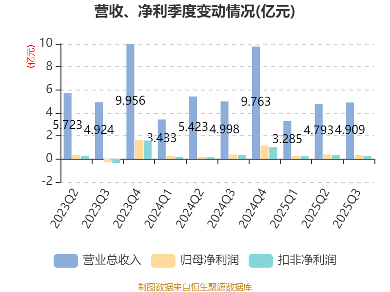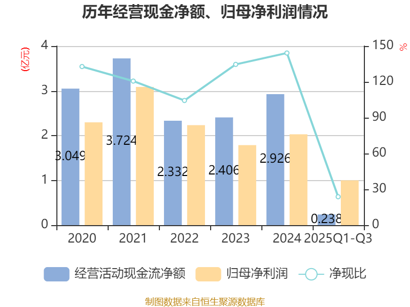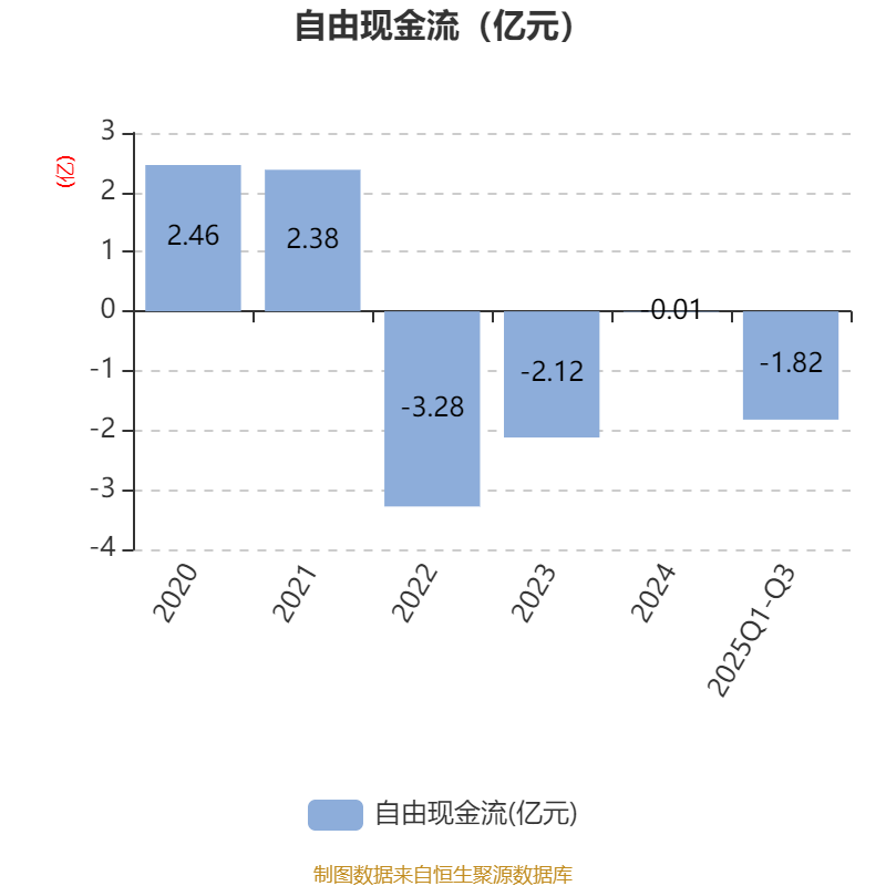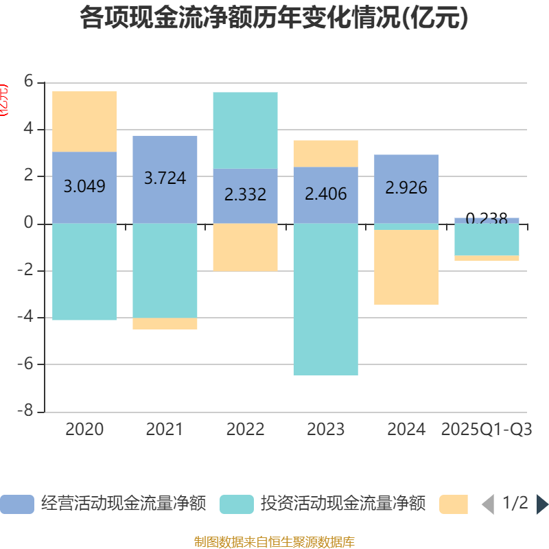 2025年前三季度,公司经营活动现金流净额为2378.66万元,同比增长89.45%;筹资活动现金流净额-2204.19万元,同比增加2.77亿元;投资活动现金流净额-1.37亿元,上年同期为7812.37万元。