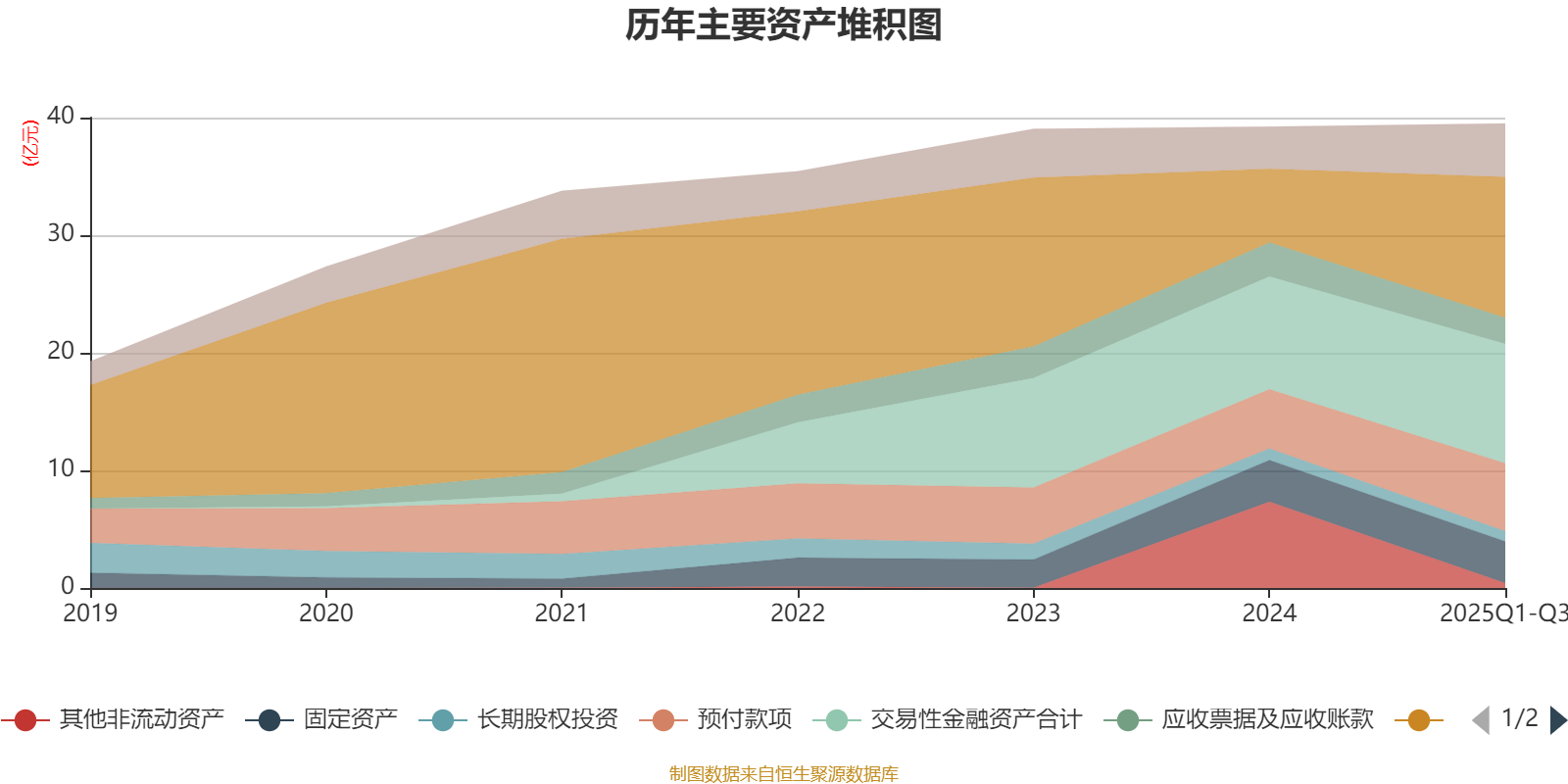 资产重大变化方面,截至2025年三季度末,公司其他非流动资产较上年末减少94.38%,占公司总资产比重下降17.67个百分点;货币资金较上年末增加91.05%,占公司总资产比重上升14.34个百分点;预付款项较上年末增加14.63%,占公司总资产比重上升1.78个百分点;应收票据及应收账款较上年末减少23.38%,占公司总资产比重下降1.77个百分点。