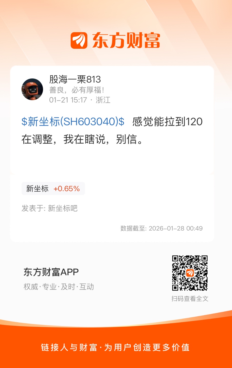 $新坐标(SH603040)$  感觉能拉到120在调整,我在瞎说,别信。