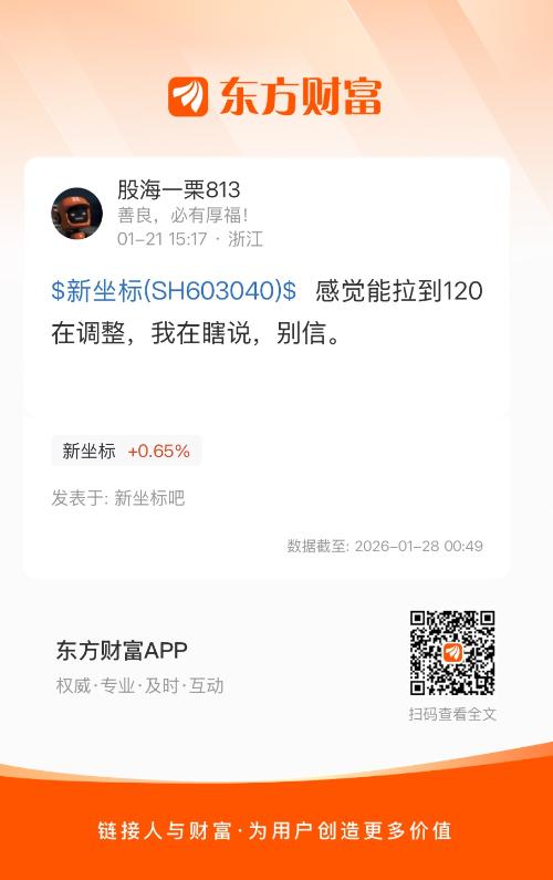 温馨提示: 1.根据《证券法》规定,禁止编造、传播虚假信息或者误导性信息,扰乱证券市场;2.用户在本社区发表的所有资料、言论等仅代表个人观点,与本网站立场无关,不对您构成任何投资建议。用户应基于自己的独立判断,自行决定证券投资并承担相应风险。《东方财富社区管理规定》