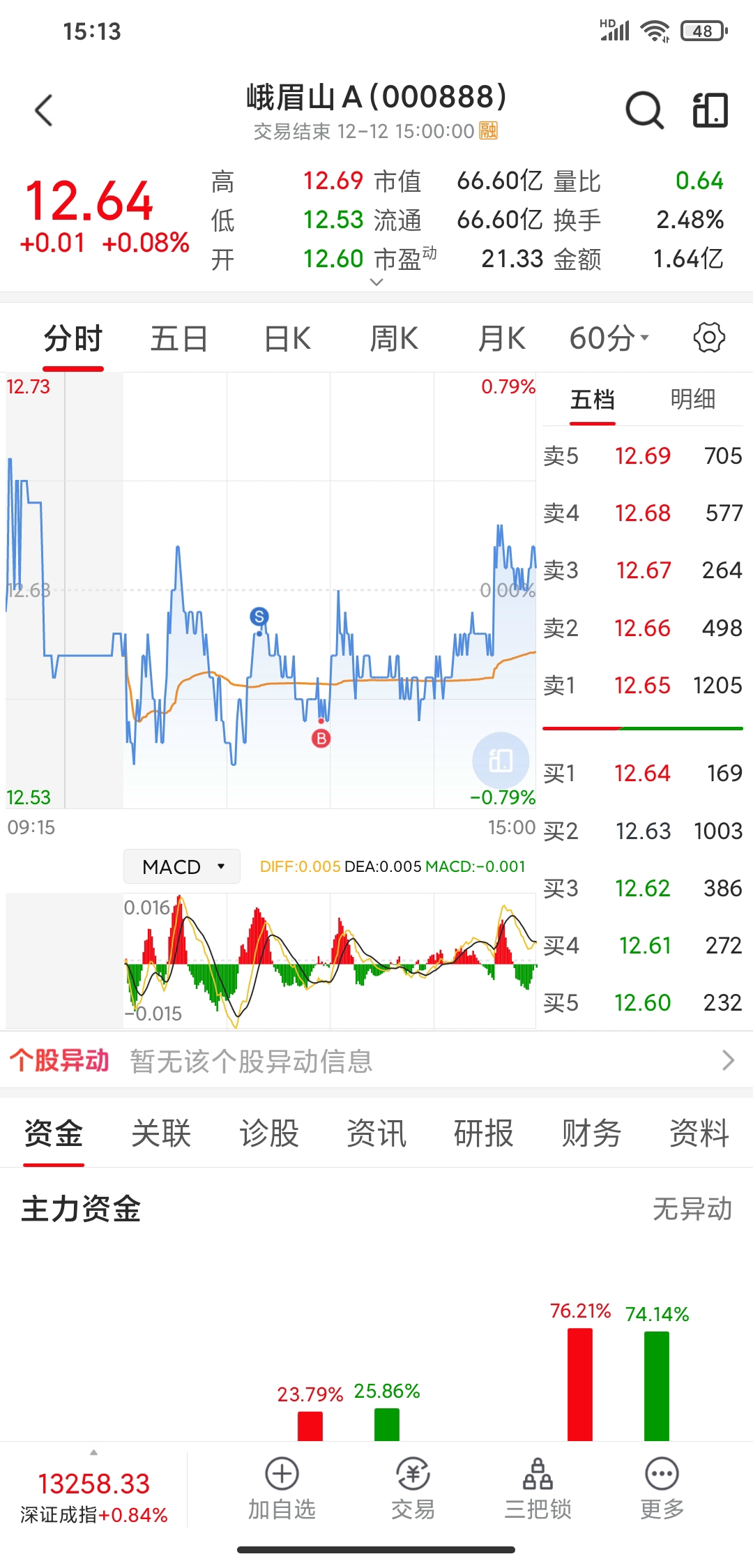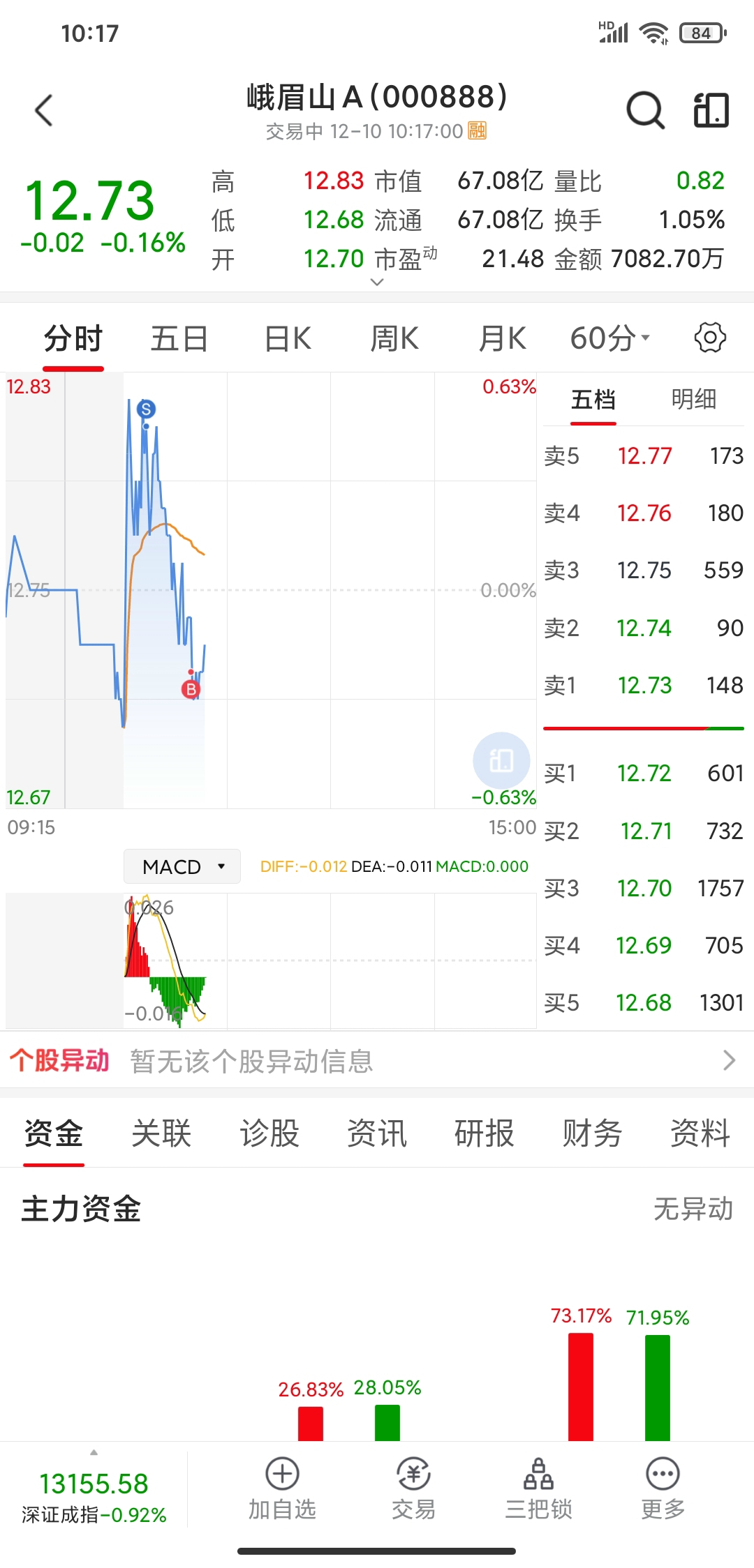 以下是我用我爸的账户,满仓做T峨眉山A。分时图的买点跟卖点还算可以。#实盘记录#