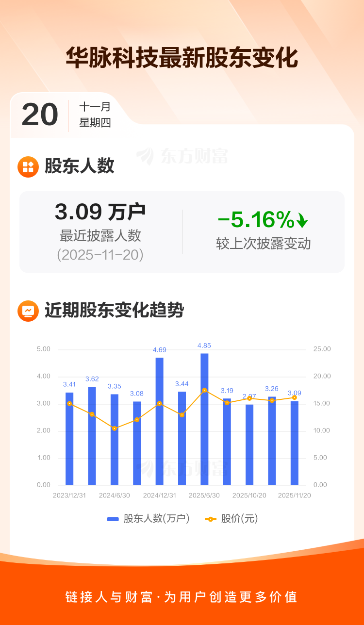 华脉科技:截至11月20日最新股东户数3.09万户,较上期减少5.16%
