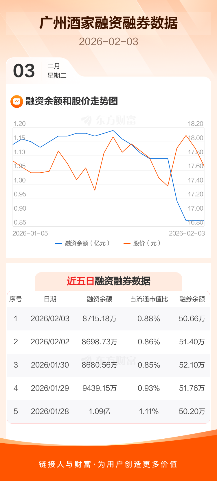 交易所最新数据显示,广州酒家于2026年2月3日获融资买入570.58万元,融资偿还554.12万元,当日融资净买入16.45万元。目前,该股融资余额8715.18万,占流通市值比例为0.88%。