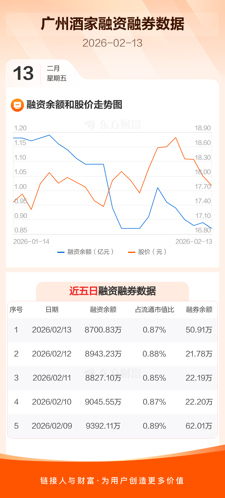 交易所最新数据显示,广州酒家于2026年2月13日获融资买入417.56万元,融资偿还659.96万元,当日融资净偿还242.4万元。目前,该股融资余额8700.83万,占流通市值比例为0.87%。