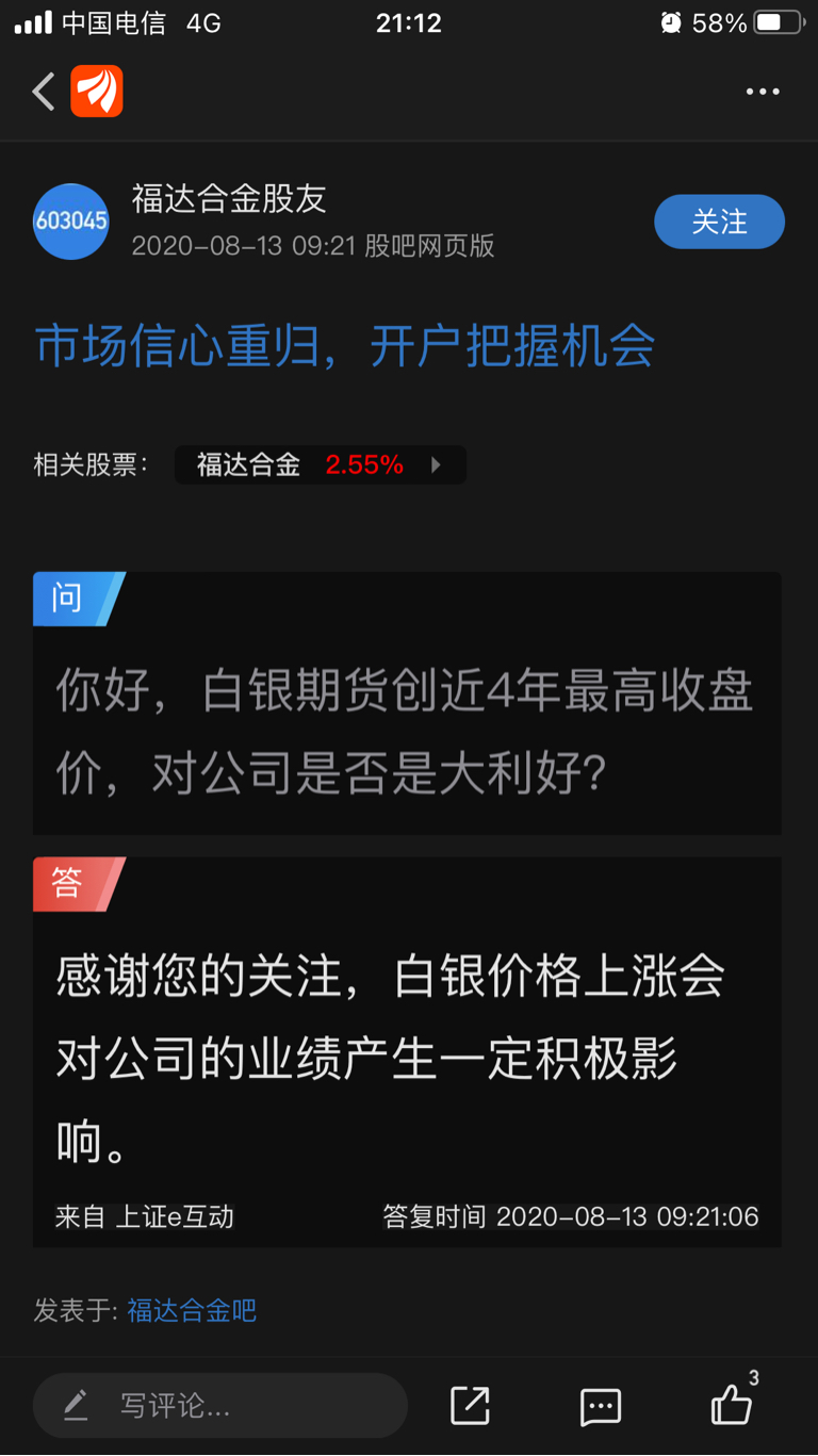 $福达合金(SH603045)$ 福达曾在公司互动平台公告白银期货创近4年最高收盘价,对公司是否是大利好?