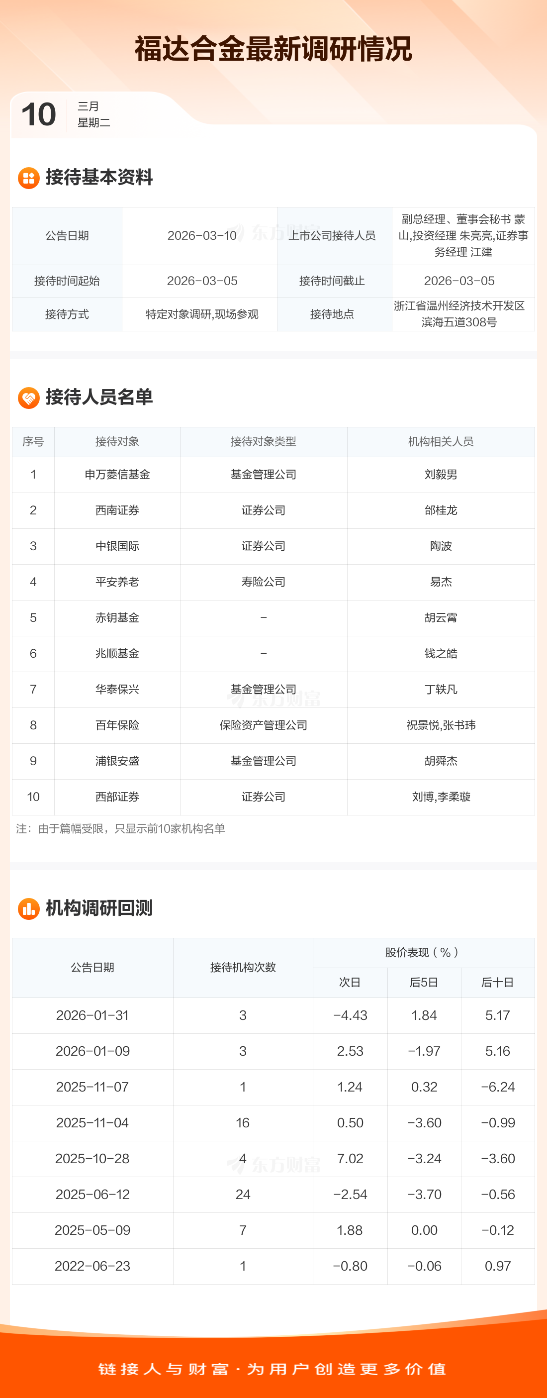 福达合金3月10日公告称,3月5日接待申万菱信基金等11家机构调研。接待人员包括副总经理、董事会秘书 蒙山,投资经理 朱亮亮,证券事务经理 江建。