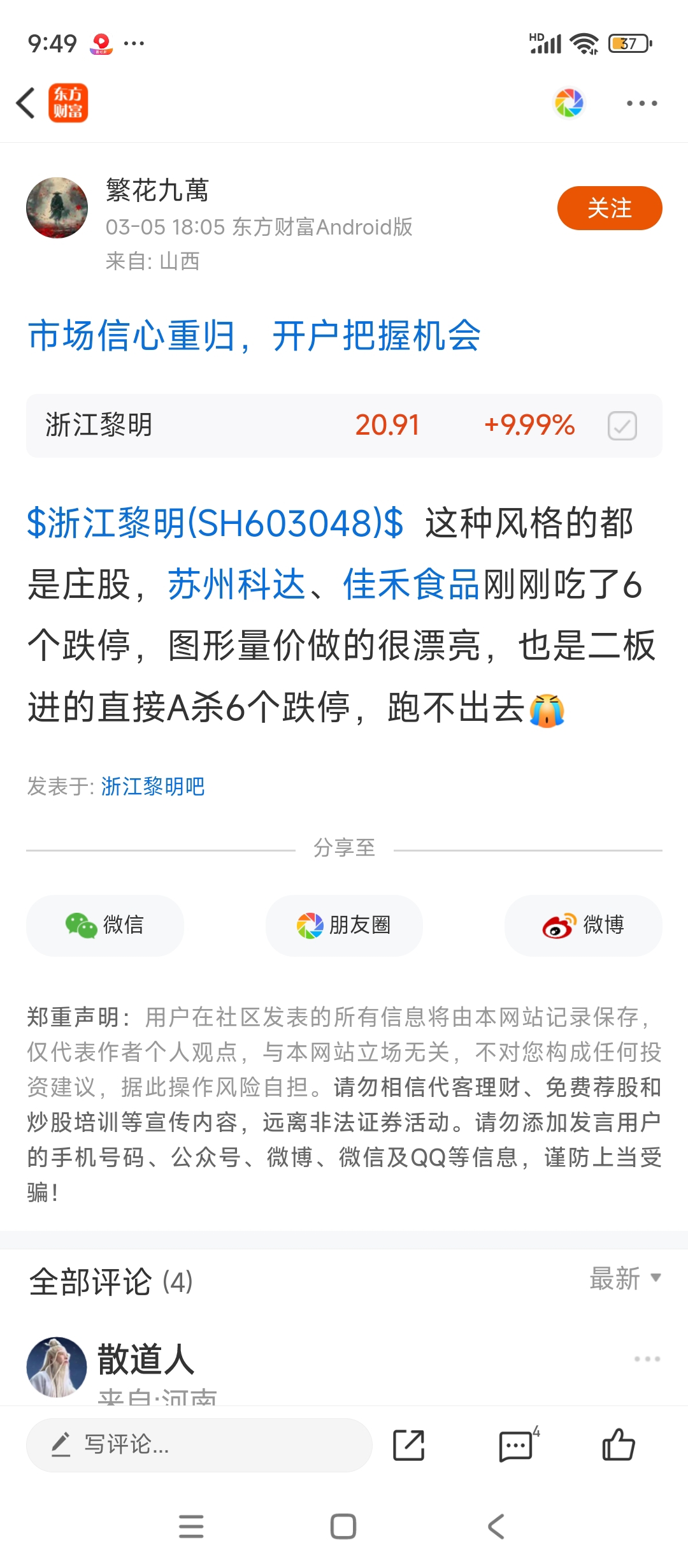 温馨提示: 1.根据《证券法》规定,禁止编造、传播虚假信息或者误导性信息,扰乱证券市场;2.用户在本社区发表的所有资料、言论等仅代表个人观点,与本网站立场无关,不对您构成任何投资建议。用户应基于自己的独立判断,自行决定证券投资并承担相应风险。《东方财富社区管理规定》