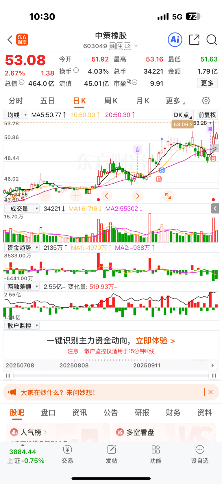 $中策橡胶(SH603049)$ 不错不错 看看看能不能站稳53