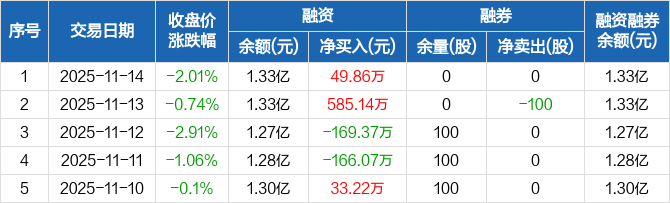 融资方面,当日融资买入789.29万元,融资偿还739.42万元,融资净买入49.86万元。融券方面,融券卖出0股,融券偿还0股,融券余量0股,融券余额0元。融资融券余额合计1.33亿元。