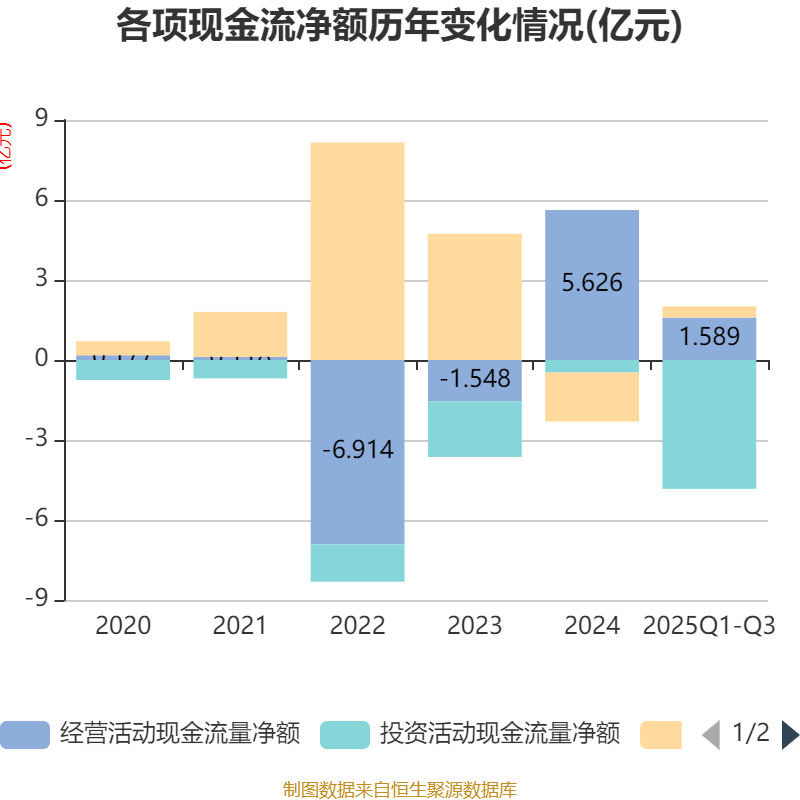 2025年前三季度,公司经营活动现金流净额为1.59亿元,同比下降32.54%;筹资活动现金流净额4218.5万元,同比增加2892.73万元;投资活动现金流净额-4.83亿元,上年同期为-2.89亿元。