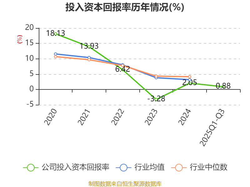 盈利能力方面, 2025年前三季度公司加权平均净资产收益率为0.75%,同比下降1.59个百分点。公司2025年前三季度投入资本回报率为0.88%,较上年同期下降1.41个百分点。