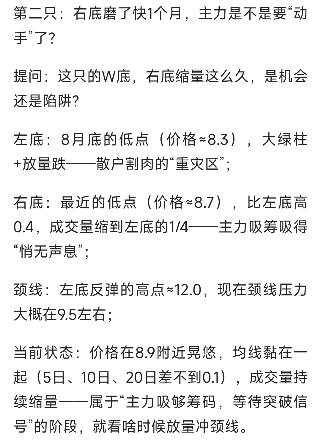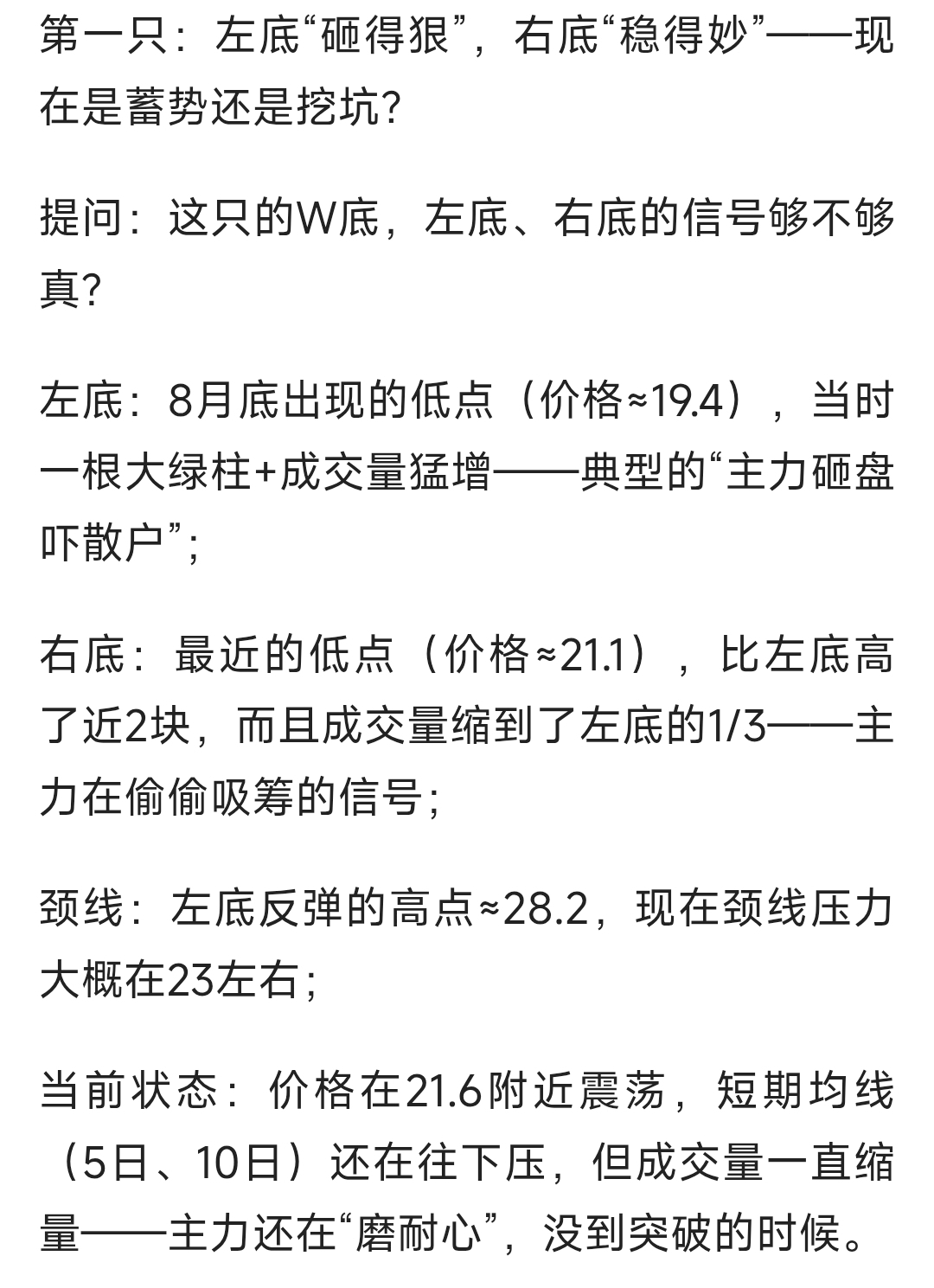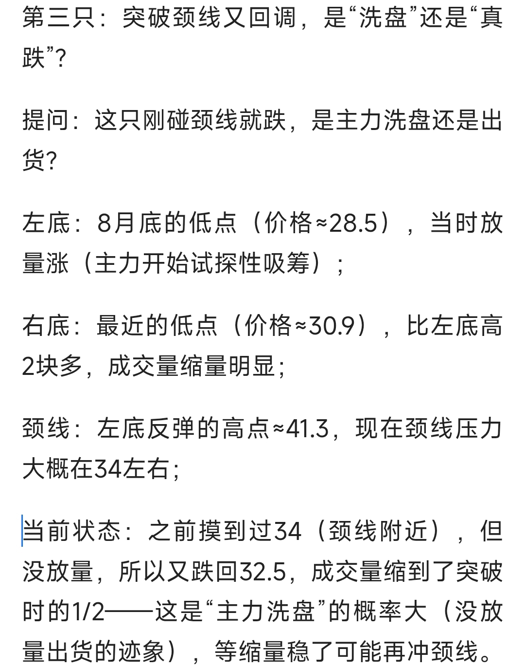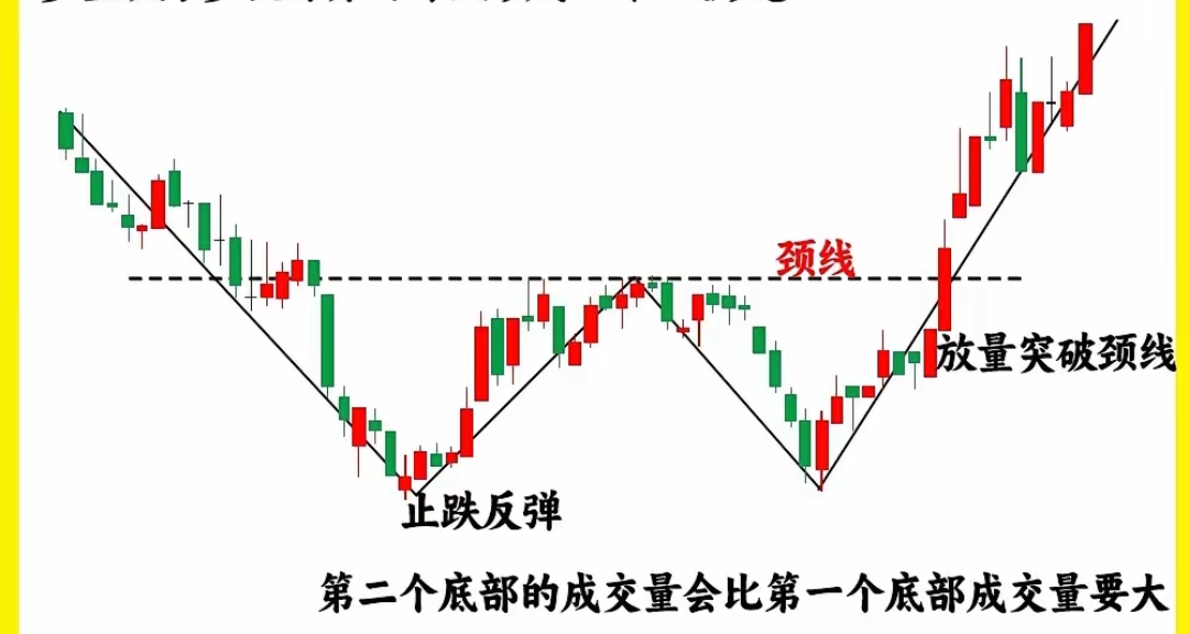 颈线:左底和右底之间的“高点连线”(这是主力的“成本线”,突破它=主力要拉升)。