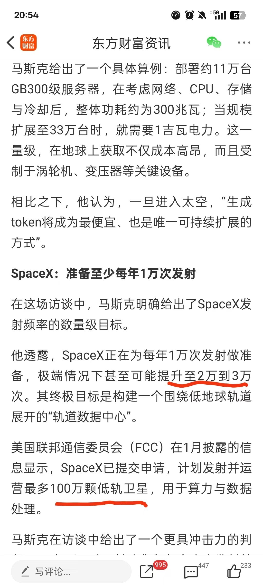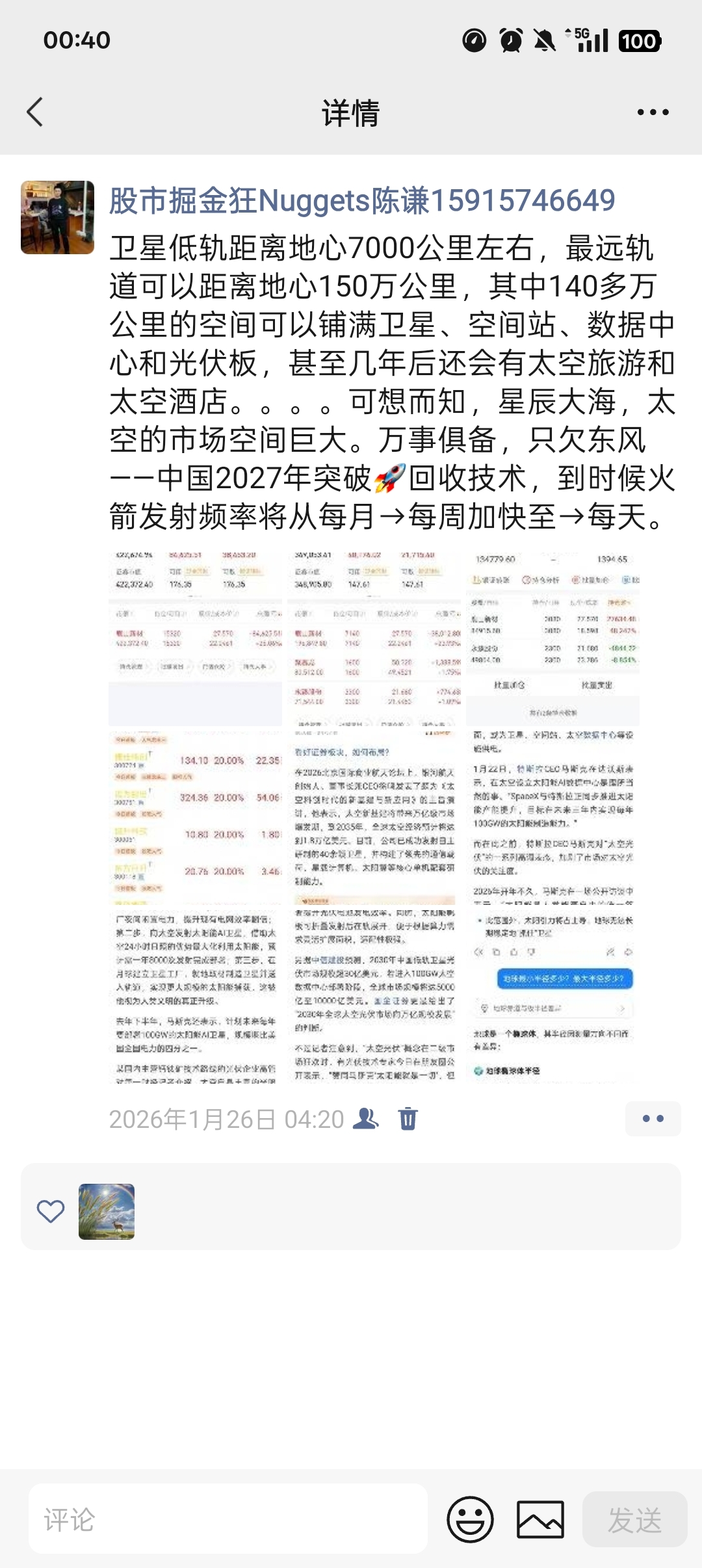 SpaceX每年发射1万次?发射100万颗卫星?2025年才发射165次,那不是要翻60倍?目前全球在轨卫星才1.5万颗,加上中国申报的20万颗,那不是要翻100多倍?先知先觉抢跑先发制人的先翻它个几倍。对于投资来说,守株待兔捡钱。